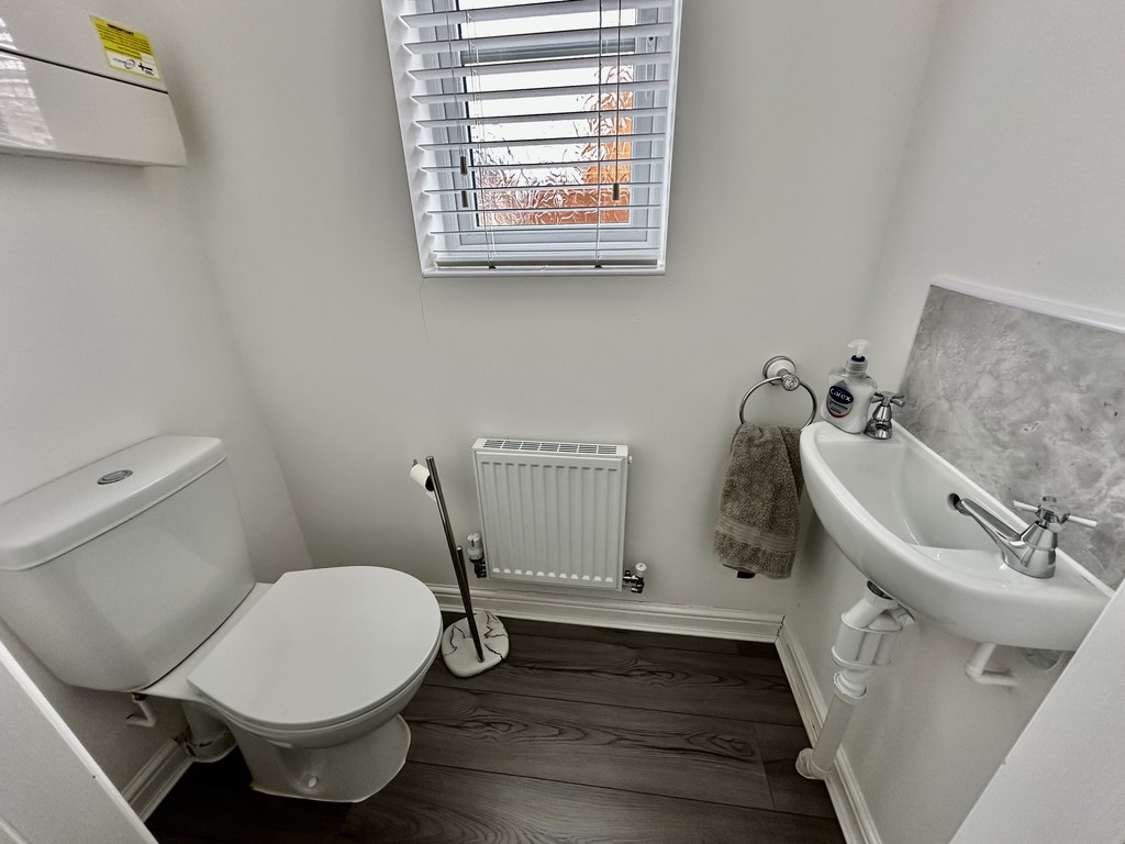 WC 2' 9" x 5' 1" (0.85m x 1.56m) Benefitting from a low flush WC, wash hand basin, laminate flooring, radiator and side facing double glazed frosted window.