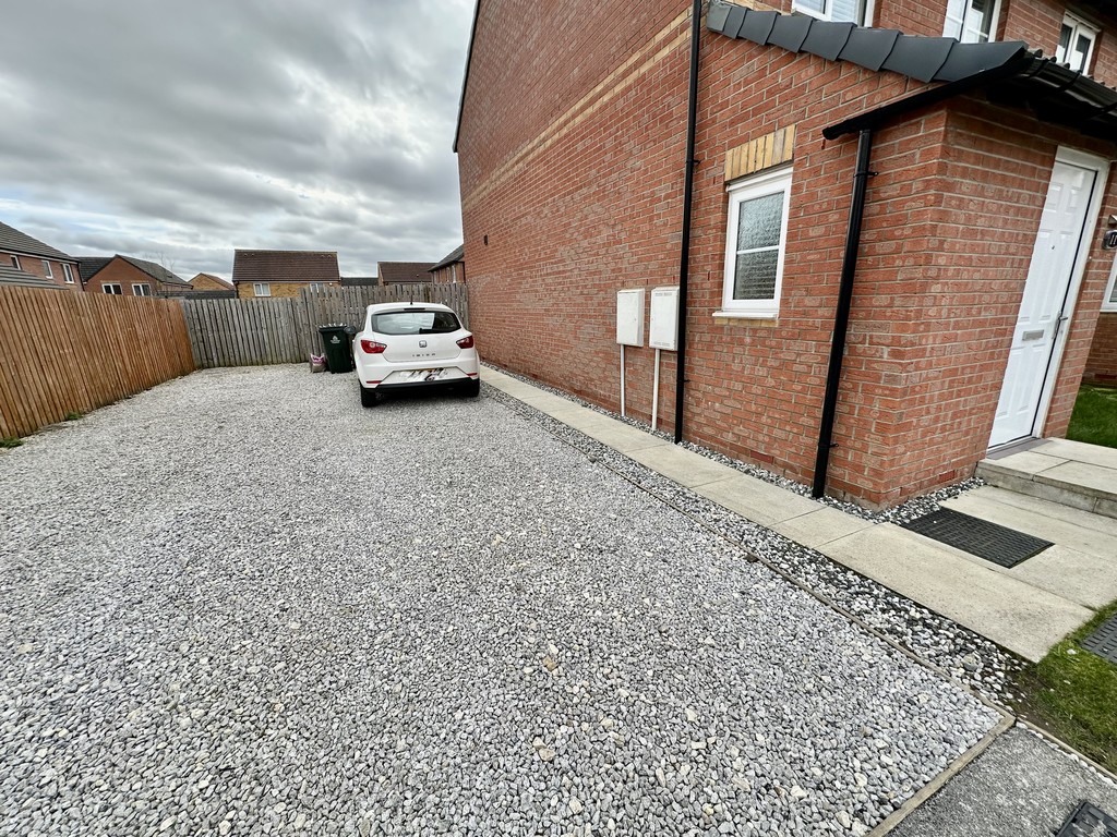 FRONT GARDEN & DRIVEWAY Small lawned front garden with paved path, side access to the rear garden via a gate and off street parking for 2/3 cars on the gravel driveway to the side.