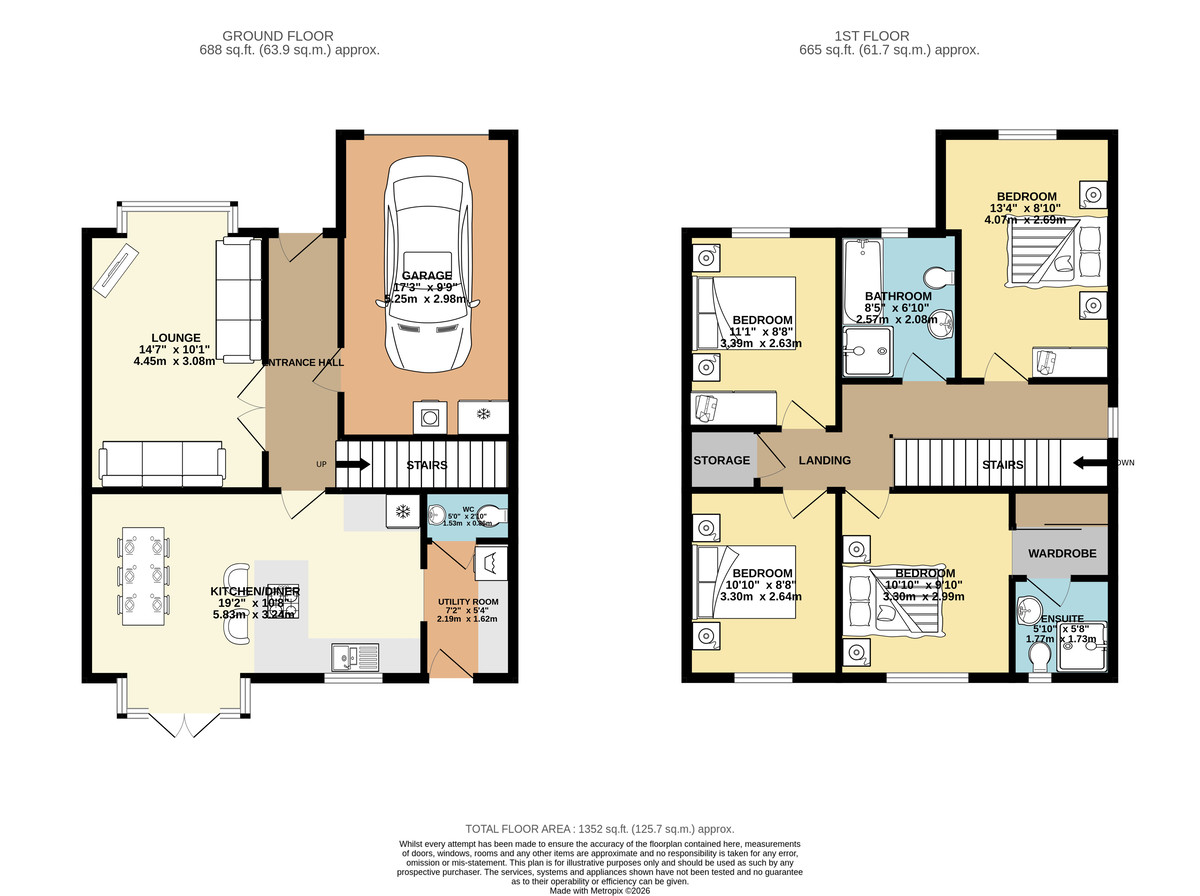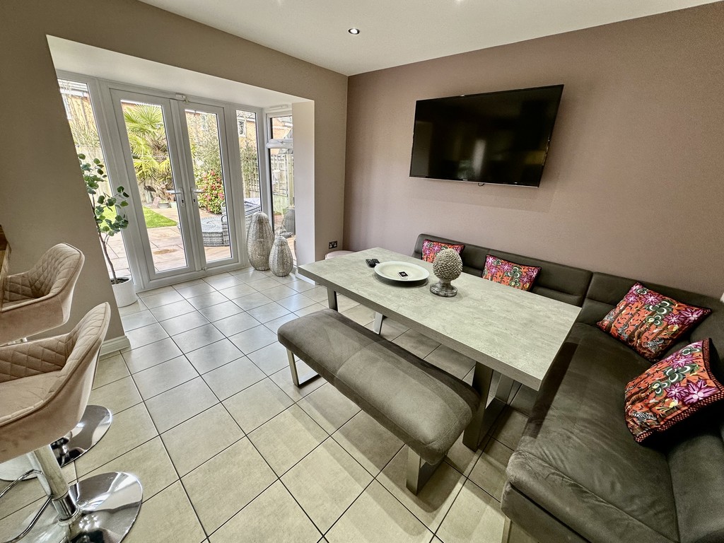 KITCHEN/DINER 19' 1" x 10' 7" (5.83m x 3.24m) Lovely open plan kitchen/dining space with rear facing double glazed French doors to the patio, rear/side facing double glazed windows, open access to the utility room, range of fitted cabinetry at both eye and base level, work surfaces with matching splash backs incorporating a single and half bowl sink with drainer, four ring gas hob with extractor hood above within the matching breakfast bar, electric single oven, integrated dishwasher, integrated fridge/freezer, tiled flooring, spotlights and a radiator.