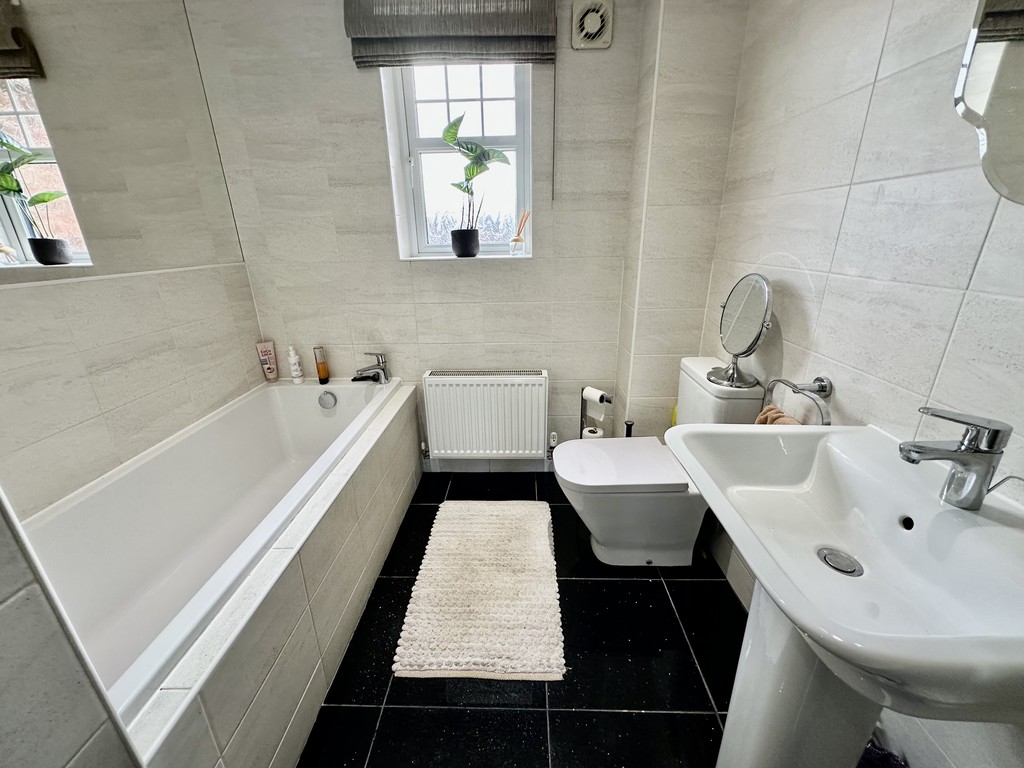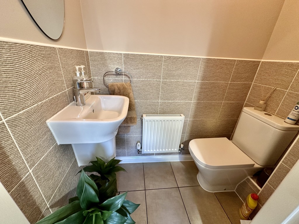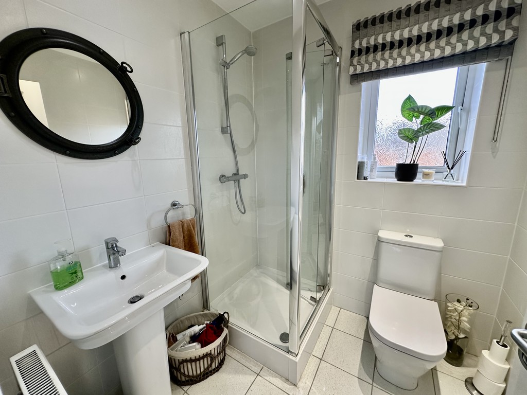 ENSUITE 5' 9" x 5' 8" (1.77m x 1.73m) Fabulous shower room with low flush WC, wash hand basin, shower cubicle, radiator, spotlights, extractor fan, tiled walls, tiled flooring and rear facing double glazed frosted window.