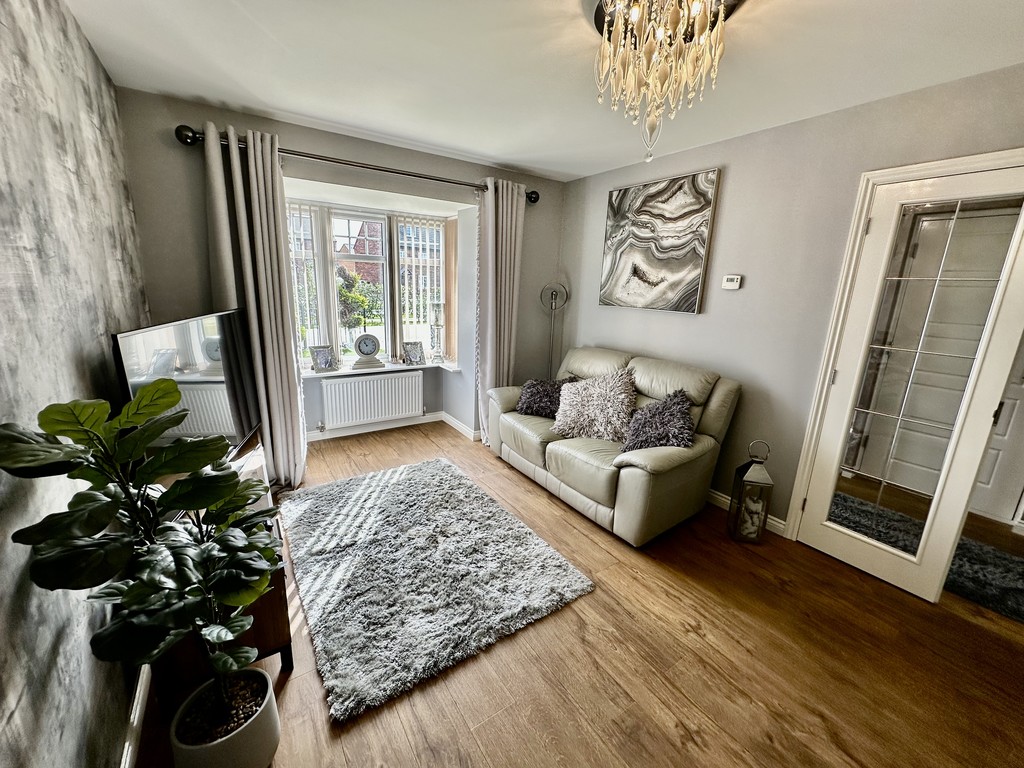 ENTRANCE HALL 4' 3" x 14' 7" (1.32m x 4.45m) This superb family home is accessed via the front facing double glazed frosted door to the hallway, radiator, stairs to the first floor, door to the garage, door to the kitchen and double doors to the living room.