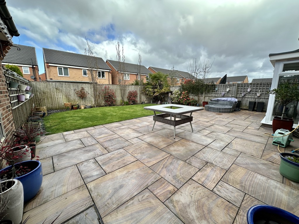 REAR GARDEN With a paved patio, mature bushes/trees, slate beds, side access via a path and a fence enclosure.