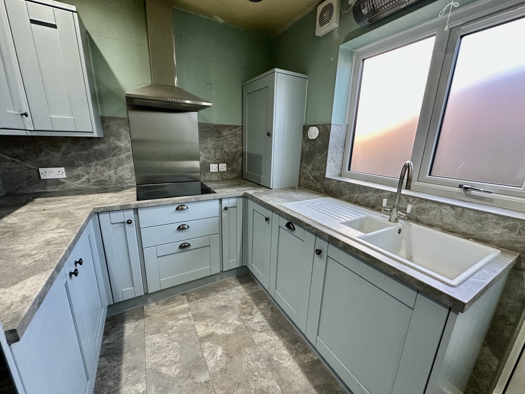 KITCHEN 8' 2" x 12' 8" (2.49m x 3.87m) Lovely kitchen space with modern fitted cabinetry at both eye and base level, work surfaces with matching splash backs, incorporating a single and half bowl sink with drainer, four ring electric hob with extractor fan above, single electric oven, integrated microwave, integrated dishwasher, space for a fridge/freezer, spotlights, storage cupboard, side facing double glazed window and side facing double glazed frosted door.