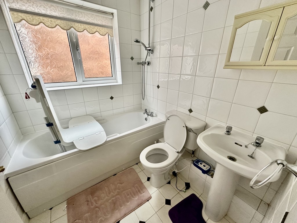 BATHROOM 6' 4" x 5' 6" (1.94m x 1.68m) Three piece suite comprising of low flush WC, wash hand basin, bath with shower above, tiled walls, extractor fan, radiator and side facing double glazed frosted window.