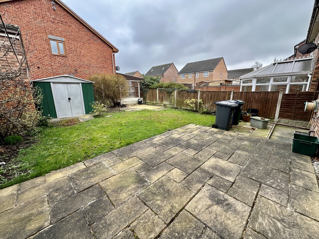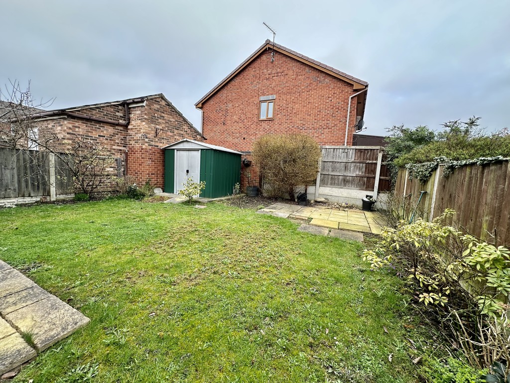 REAR GARDEN Lawned area, paved patio, trees/bushes, further raised patio, shed, fence/wall enclosed and side access gate to the front.