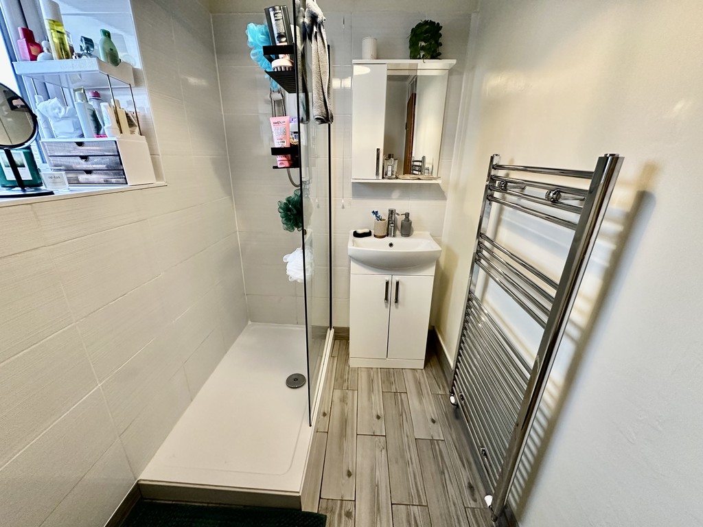SHOWER ROOM 4' 10" x 8' 2" (1.49m x 2.49m) Nicely presented shower room with low flush WC, wash hand basin within a vanity unit, heated towel radiator, mirrored storage cabinet, walk in shower area with glass screen, electric shower unit, partially tiled walls, tiled flooring and front facing double glazed frosted window.