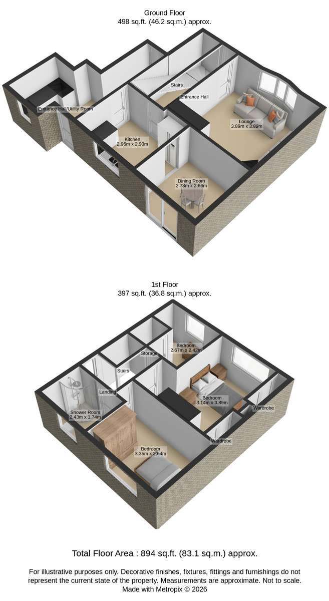 SHOWER ROOM 7' 11" x 5' 8" (2.43m x 1.74m) Shower room benefits from fitted vanity storage beneath the wash hand basin, low flush WC, corner shower cubicle with electric shower unit, tiled flooring, tiled walls, heated towel radiator and rear facing double glazed frosted window.