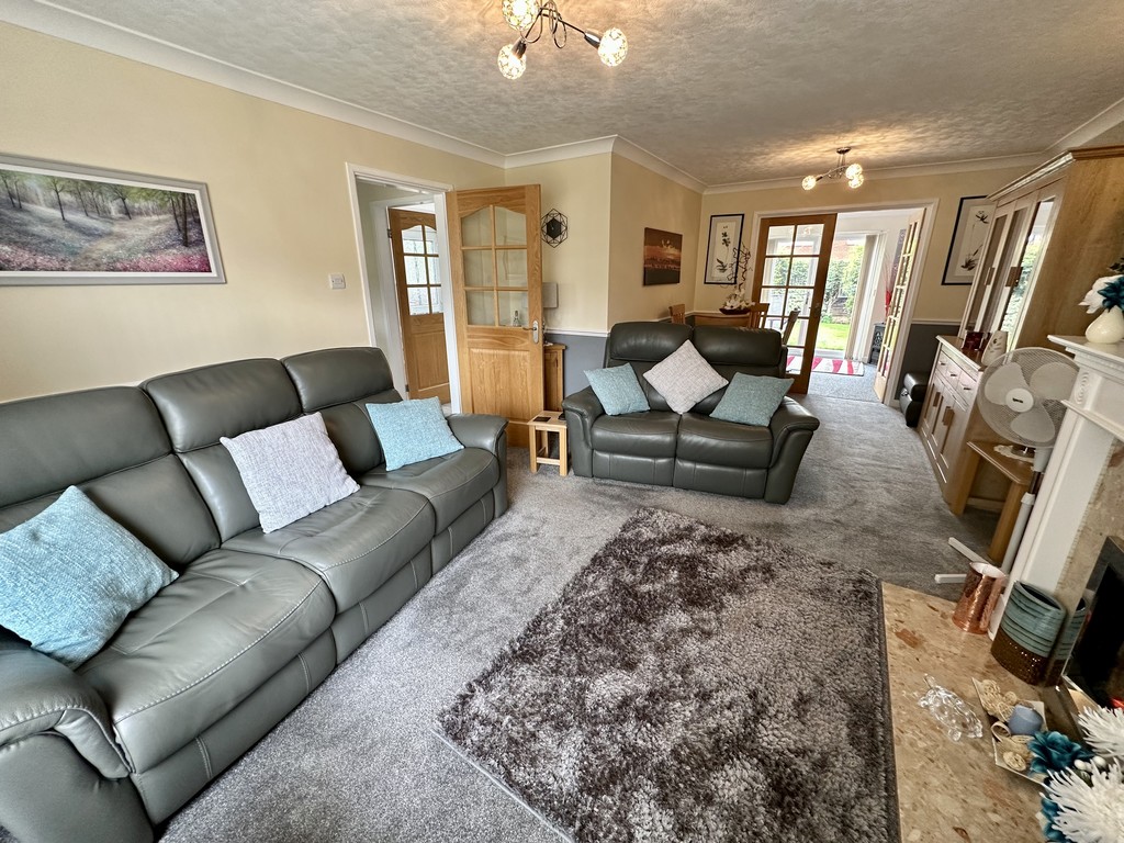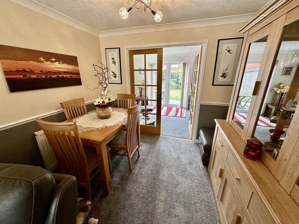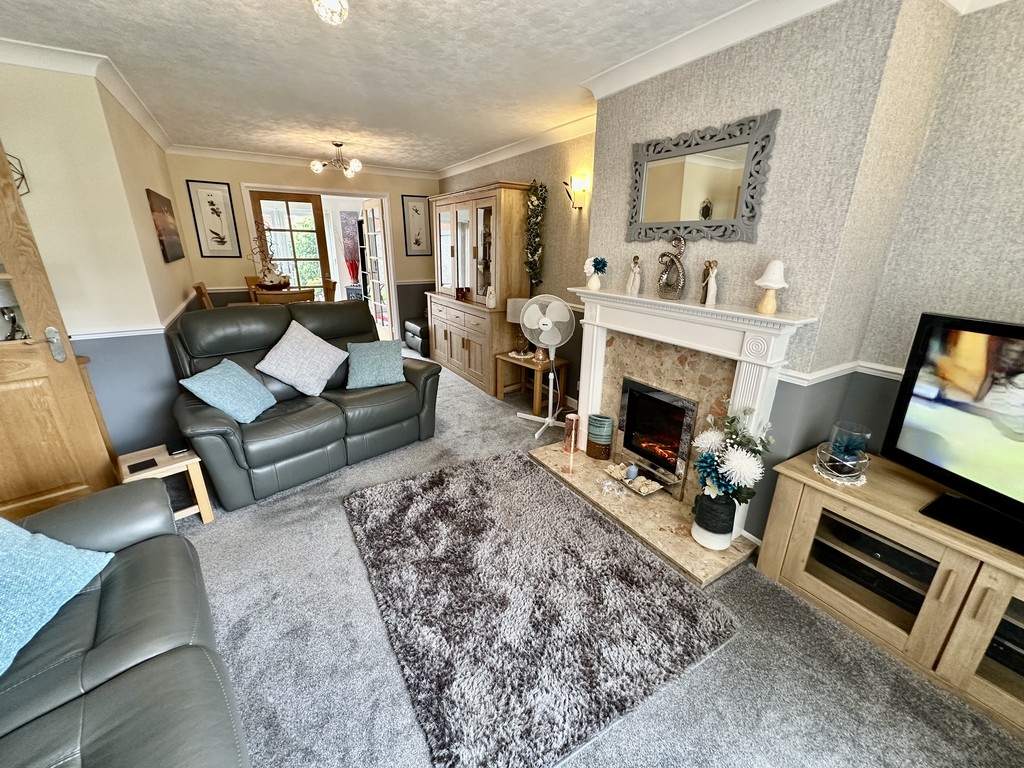 LOUNGE/DINER 12' 10" x 20' 9" (3.92m max x 6.35m max) L-shaped reception room with rear facing double doors to the extension, this room is ideal for living/dining with front facing double glazed window, feature log effect fireplace with decorative surround, coving to the ceiling, dado rail and radiator.