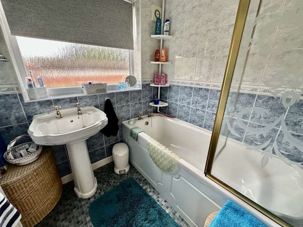 BATHROOM 5' 10" x 5' 5" (1.79m x 1.67m) Comprising of a wash hand basin, bath with bi-folding shower screen, shower unit, partially tiled walls, radiator, extractor fan and rear facing double glazed frosted window.