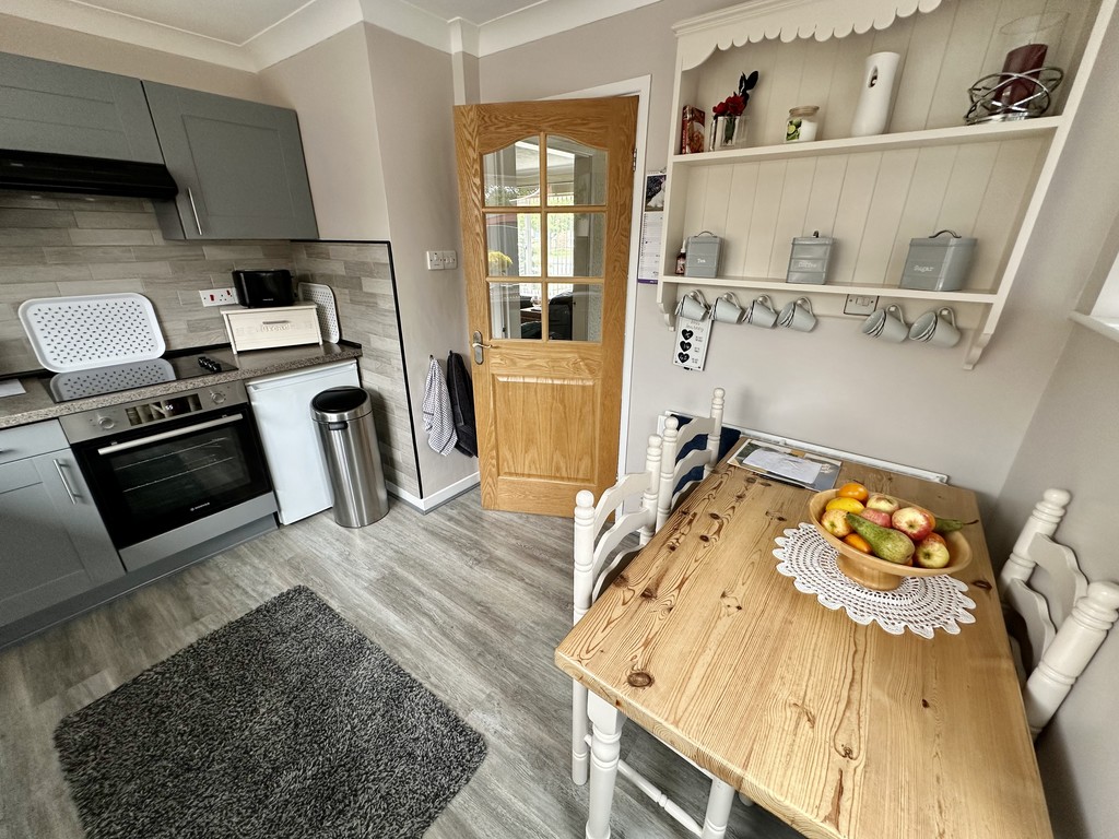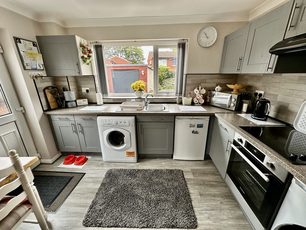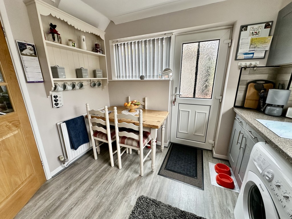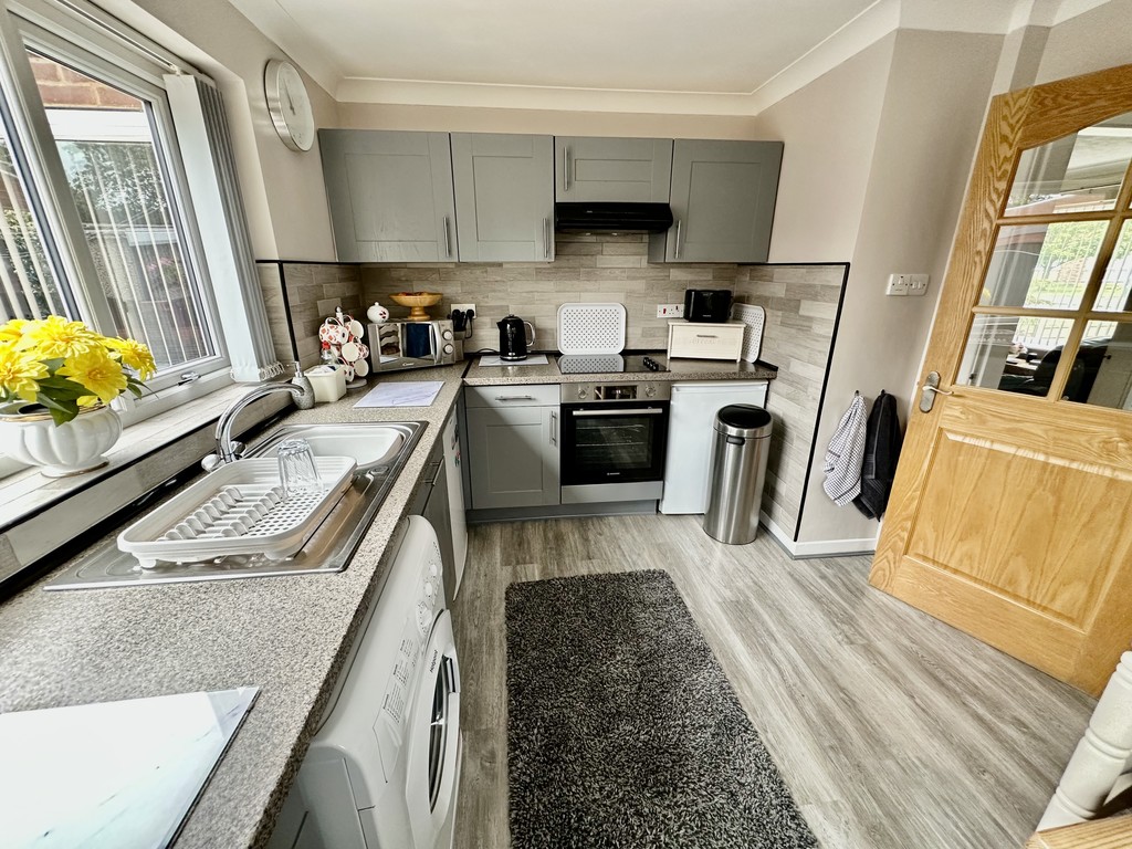 KITCHEN/BREAKFAST ROOM 10' 9" x 9' 4" (3.30m max x 2.86m max) Beautiful kitchen with a range of fitted cabinetry at both eye and base level, work surfaces incorporating a single bowl sink with drainer, four ring electric hob with extractor fan above, single electric oven, space for a fridge/freezer, plumbing for a washing machine, partially tiled walls, radiator, rear/side facing double glazed windows and side facing double glazed frosted door to the driveway.