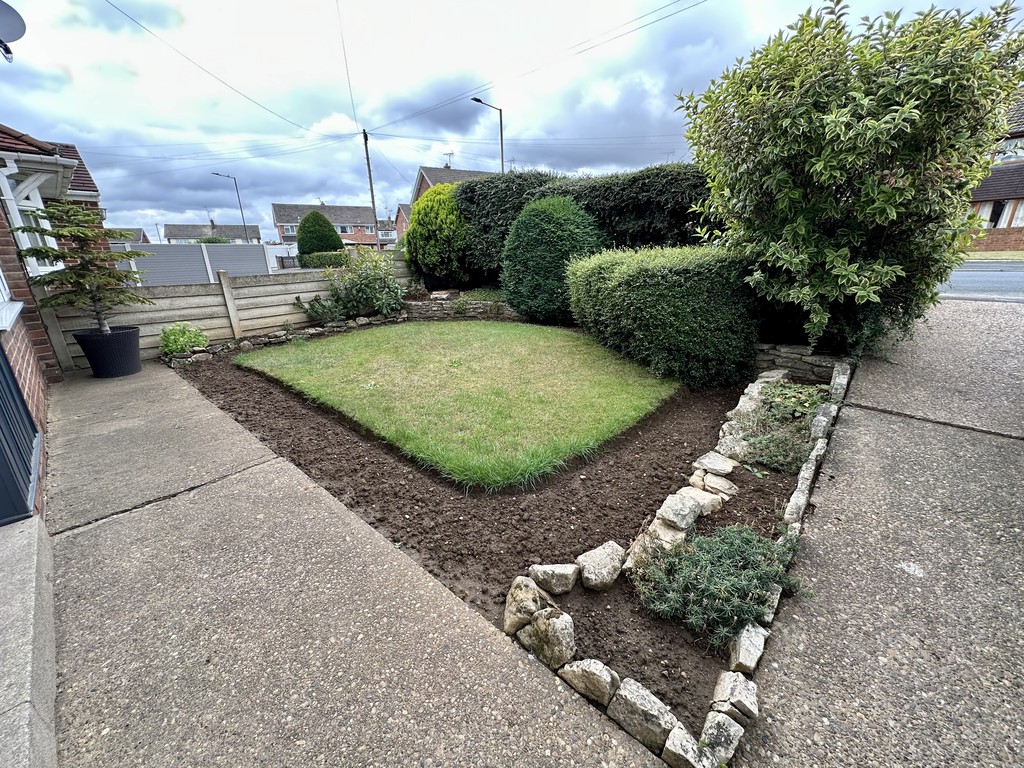 FRONT GARDEN/DRIVEWAY Small front lawned garden with surrounding planting beds, driveway provides off street parking and double gates lead to the rear driveway/garden.