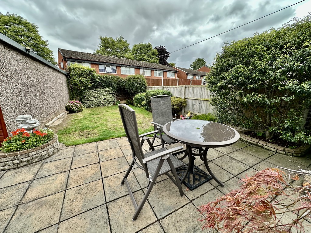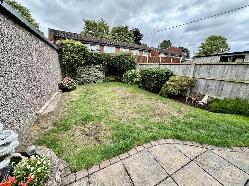 REAR GARDEN Lawned rear garden with shrub beds, flower beds, paved patio and a fence/wall enclosure.