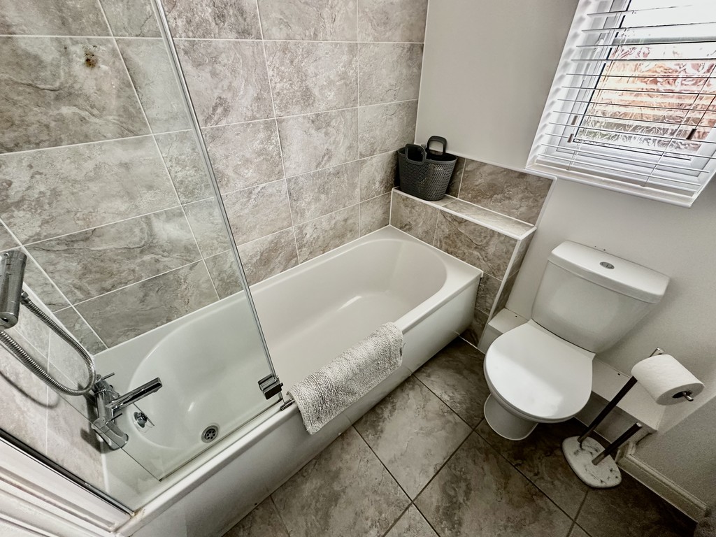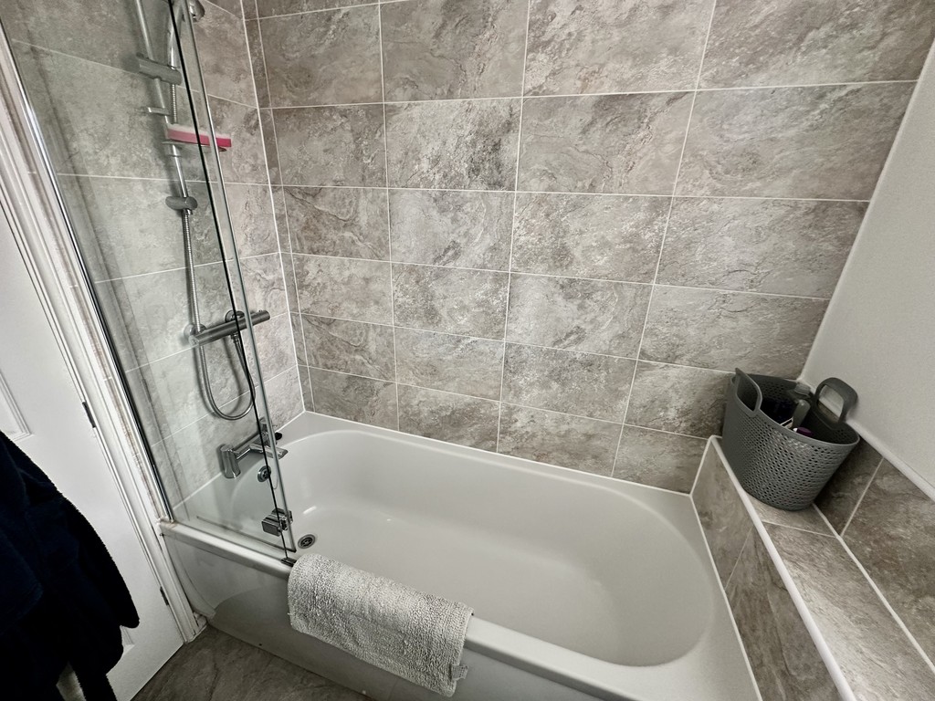 BATHROOM 6' 0" x 6' 0" (1.85m x 1.85m) Pleasantly presented bathroom with three piece suite comprising of a low flush WC, wash hand basin, bath with bi-folding shower screen, shower unit above, partially tiled walls, tiled flooring, heated towel radiator and rear facing double glazed frosted window.