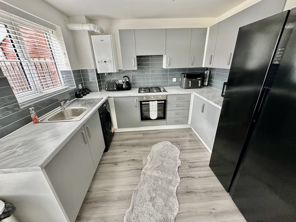 KITCHEN/DINER 14' 6" x 9' 7" (4.43m x 2.93m) Fantastic modern kitchen with a range of fitted cabinetry, work surfaces incorporating a single bowl sink with drainer, partially tiled splash backs, four ring gas hob with extractor fan above, single electric oven, space for a fridge/freezer, plumbing for a washing machine, radiator, laminate flooring, rear facing double glazed window and rear facing double glazed French doors to the garden.