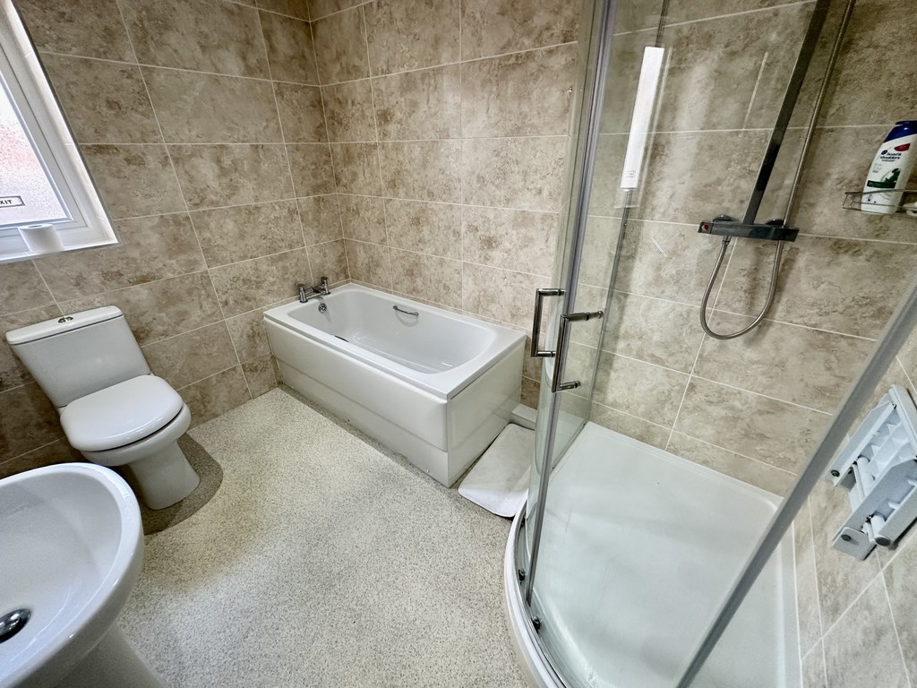BATHROOM 8' 7" x 8' 11" (2.64m x 2.72m) Beautiful bathroom with separate corner shower cubicle with dual shower head, bath, tiled walls, low flush WC, wash hand basin, spotlights, radiator and rear facing double glazed frosted window.