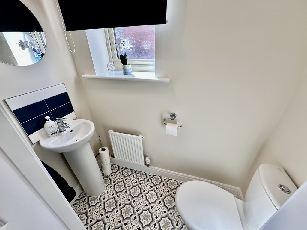 WC 2' 6" x 5' 7" (0.78m x 1.72m) Benefitting from a low flush WC, wash hand basin, partially tiled splash back, radiator, tiled flooring and side facing double glazed frosted window.