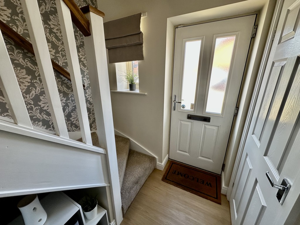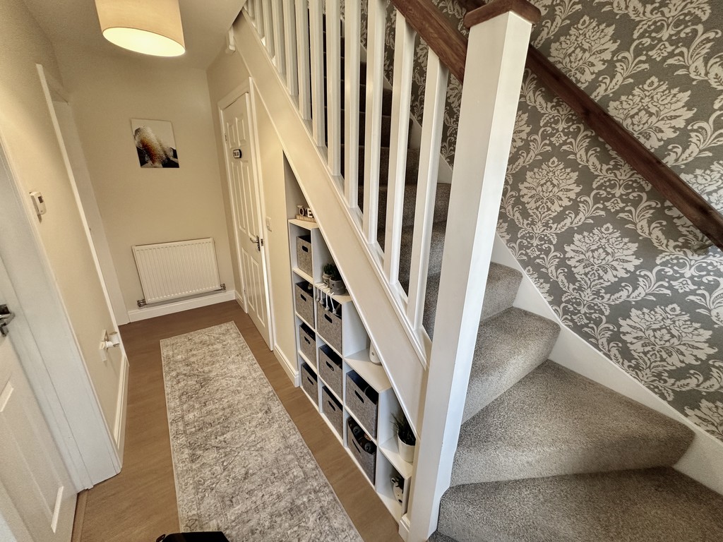 ENTRANCE HALL 6' 2" x 13' 8" (1.88m x 4.19m) This delightful family property is accessed via the front facing double glazed frosted door to the entrance hallway, front facing double glazed window, storage cupboard, door to the WC, alarm system, radiator, door to the kitchen and living room.
