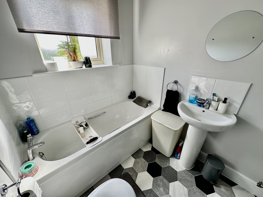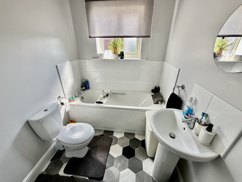 BATHROOM 5' 8" x 9' 2" (1.75m x 2.81m) Nicely presented bathroom with four piece suite comprising of a bath, partially tiled splash backs, low flush WC, wash hand basin, separate shower cubicle, radiator, extractor fan and rear facing double glazed frosted window.
