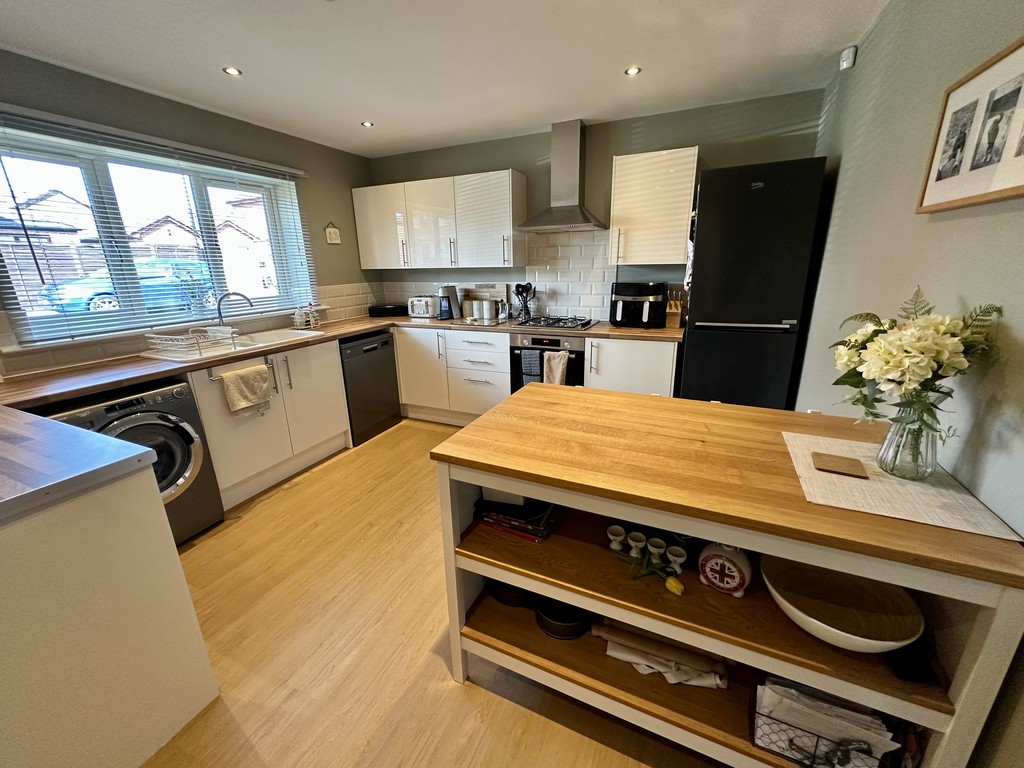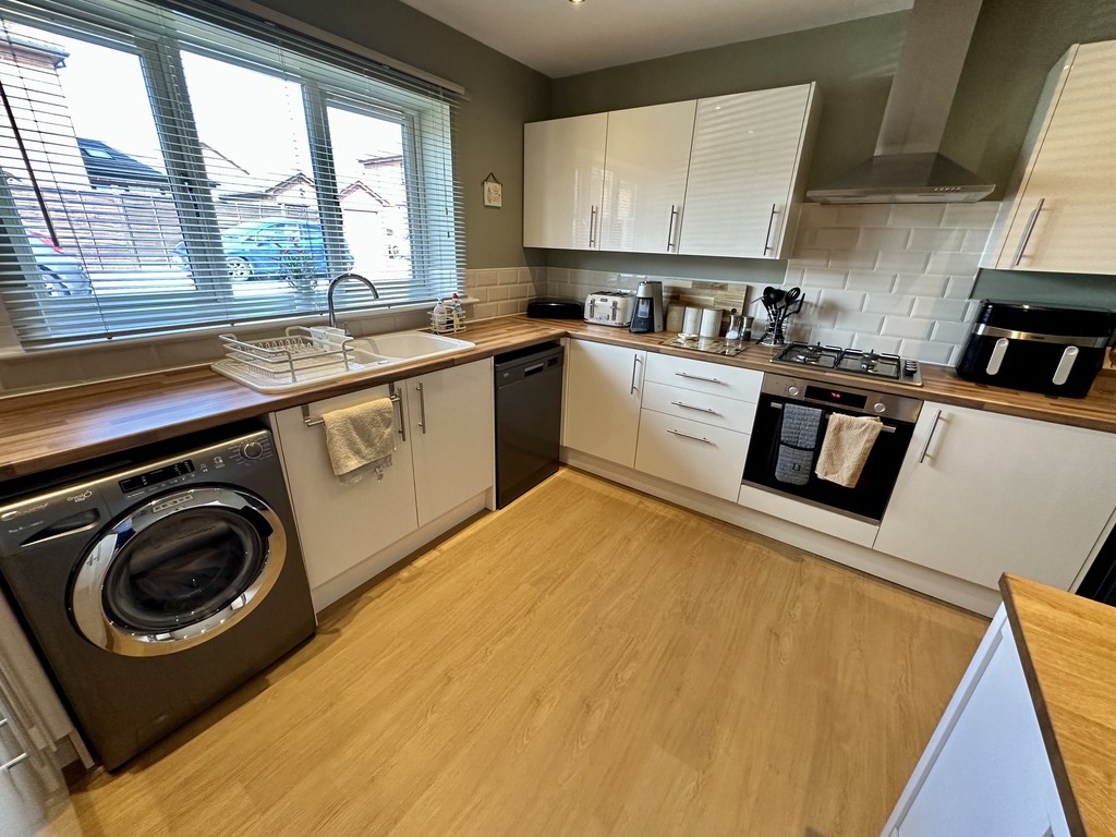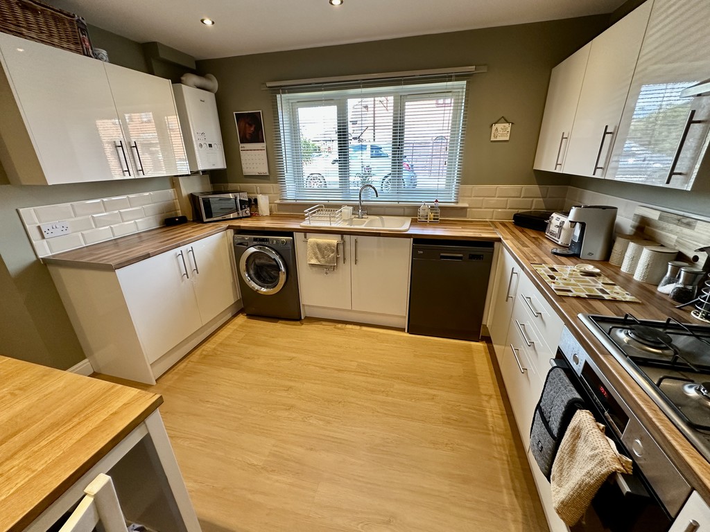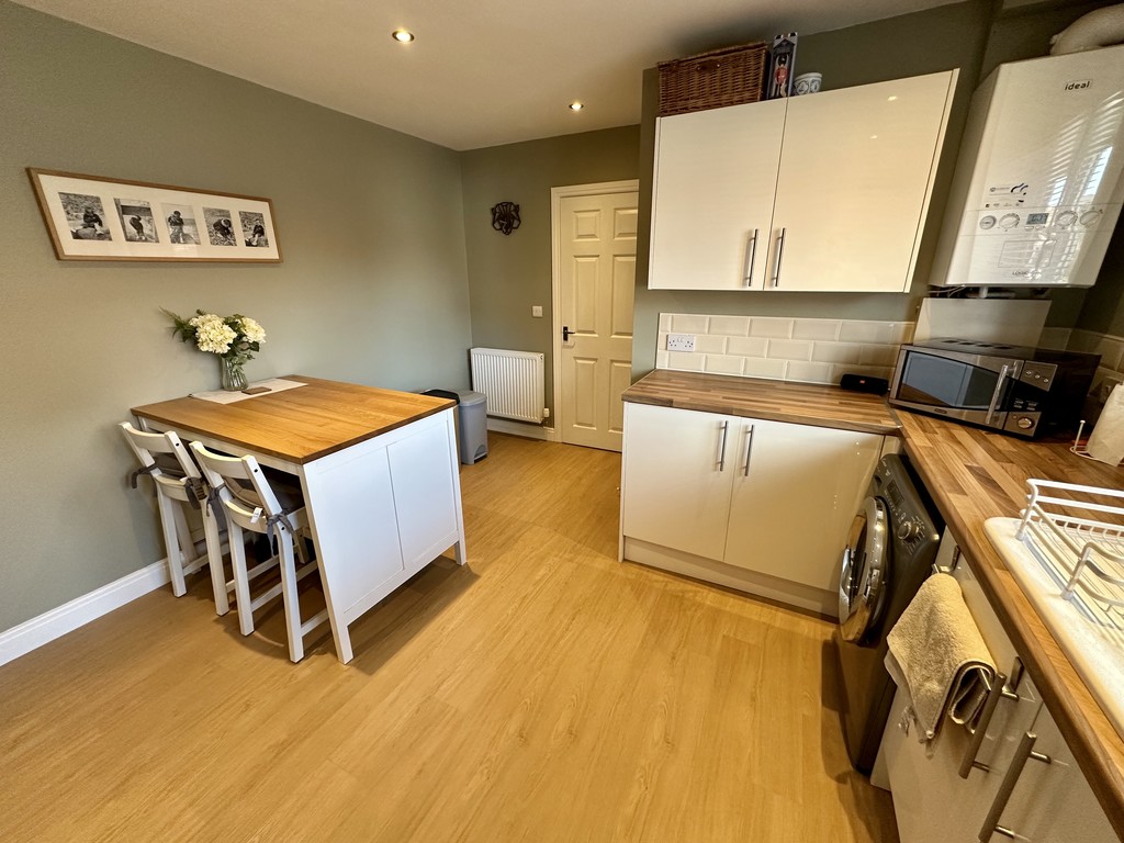 KITCHEN/DINER 14' 2" x 11' 10" (4.33m max x 3.63m max) The beautiful kitchen comprises of a range of modern fitted cabinetry at both eye and base level, work surfaces incorporating a single and half bowl sink with drainer, four ring gas hob with extractor hood above, single electric oven, plumbing for a washing machine, plumbing for a dishwasher, space for a fridge/freezer, spotlights, radiator, partially tiled walls, boiler unit and front facing double glazed window.