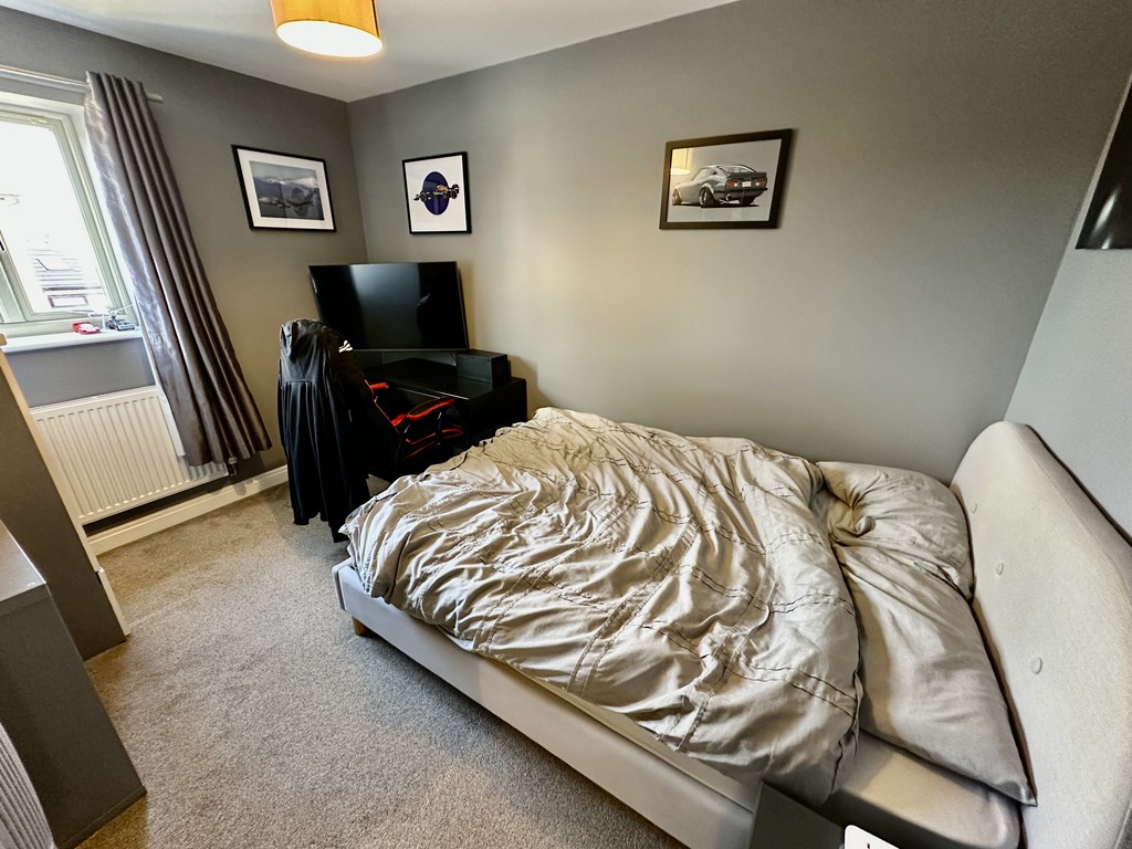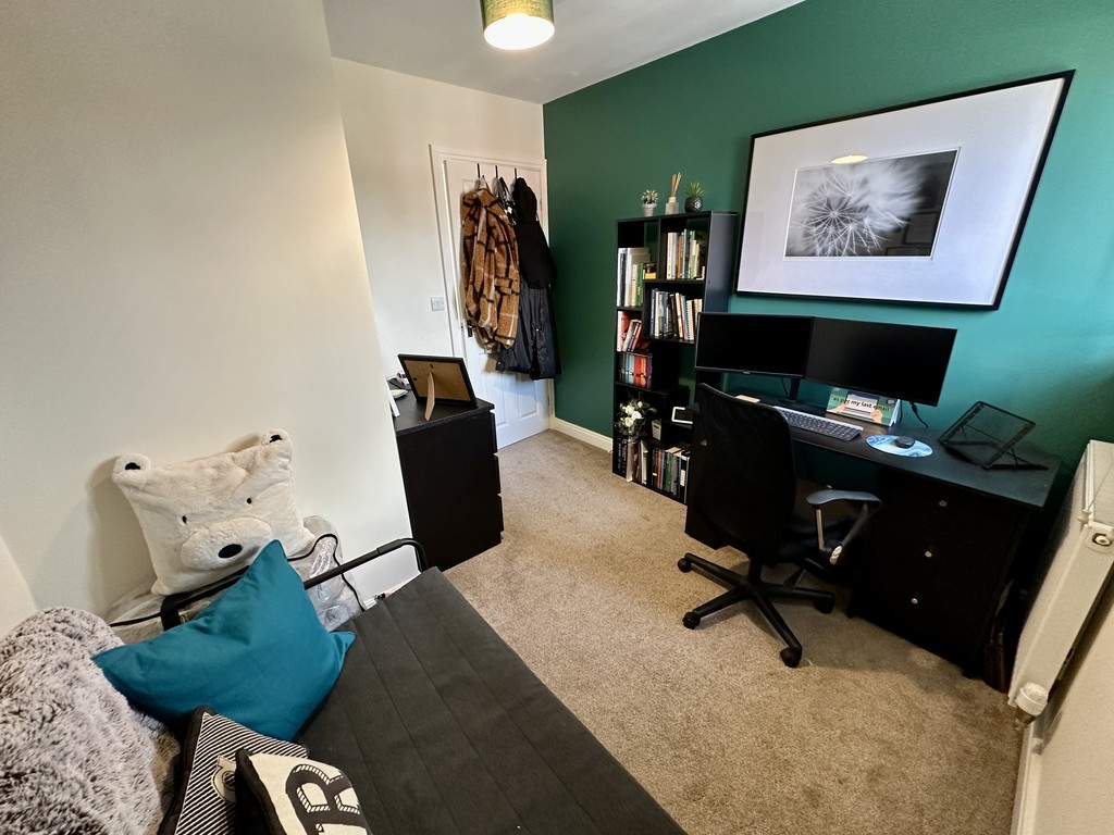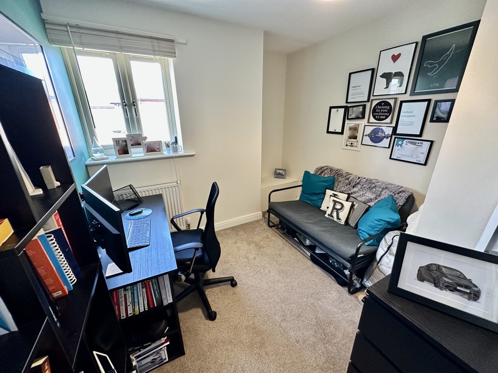 BEDROOM 9' 0" x 9' 8" (2.76m max x 2.97m max) The third bedroom is spacious and currently utilised as an office space with front facing double glazed window and a radiator.