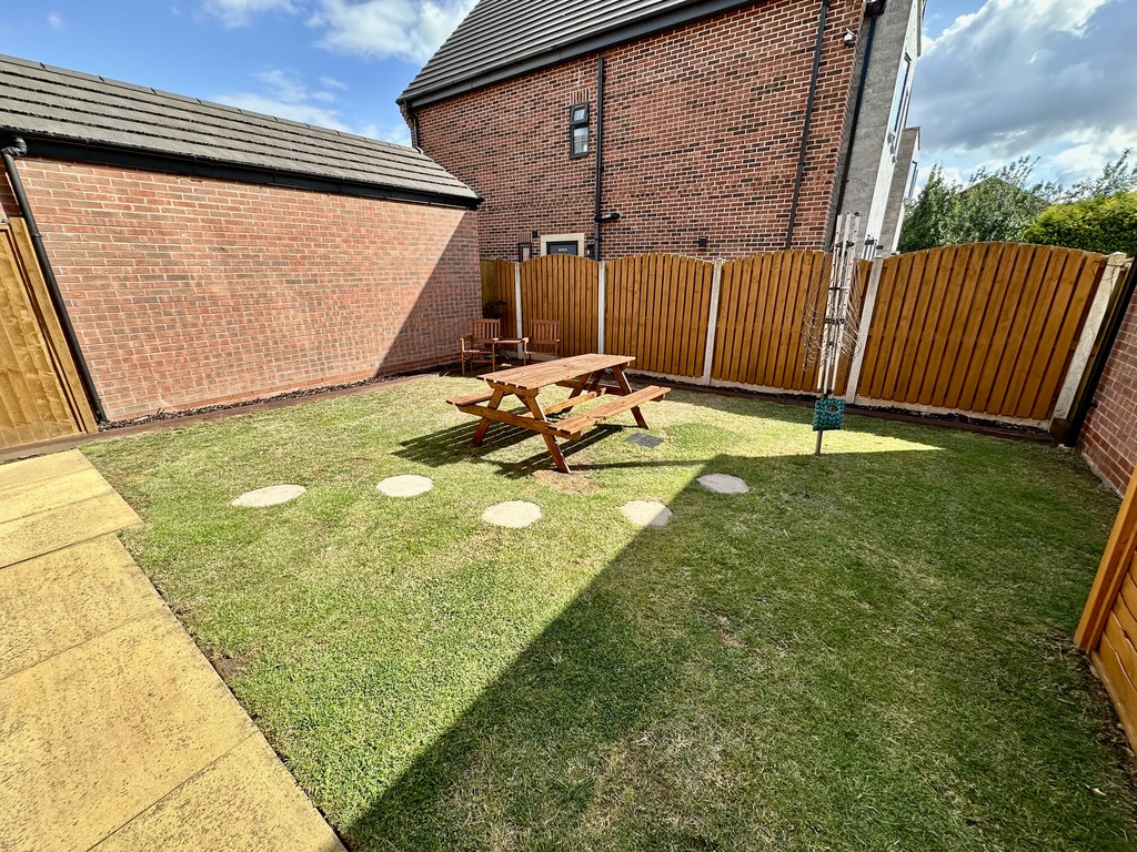 REAR GARDEN Fence/wall enclosed rear garden with central lawn and raised sleeper borders.