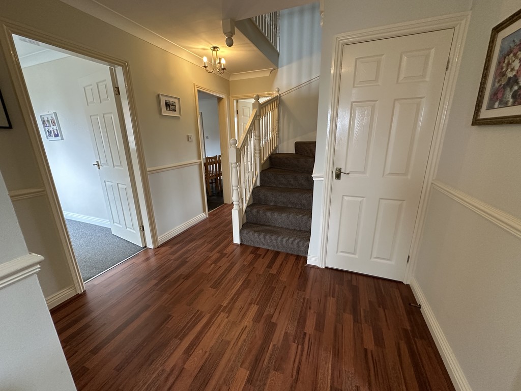 ENTRANCE HALL 5' 1" x 17' 7" (1.56m x 5.38m) The property is accessed via the front facing double glazed frosted door to the entrance hallway, radiator, dado rail, coving, storage cupboard, laminate flooring and stairs to the first floor.