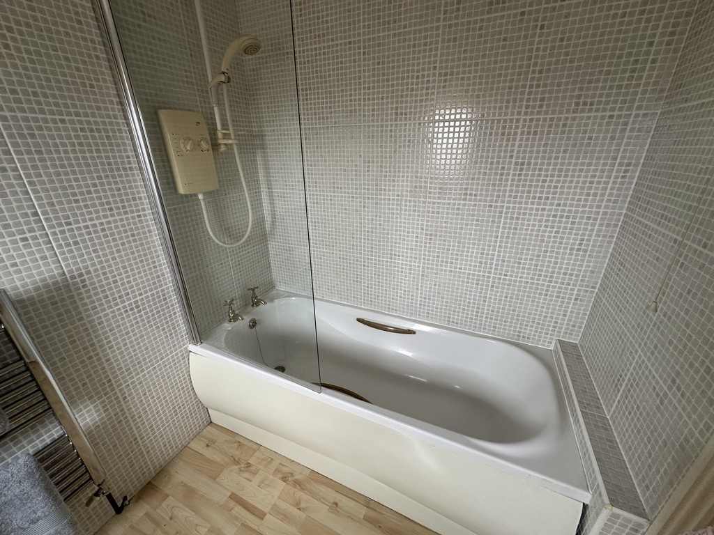 BATHROOM 8' 11" x 5' 8" (2.74m x 1.75m) Nicely presented bathroom with three piece suite comprising of a low flush WC, wash hand basin, bath with shower screen mounted above, shower unit, tiled walls partially, shaving point, radiator and front facing double glazed frosted window.