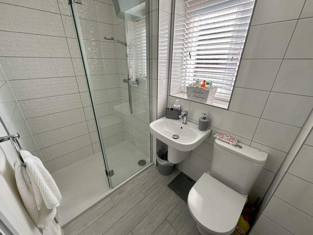 ENSUITE 7' 4" x 4' 5" (2.24m x 1.36m) Nicely presented shower room with low flush WC, floating wash hand basin, walk-in shower area with glass divide, single shower head, partially tiled walls, tiled flooring, spotlights, extractor fan, radiator and front facing double glazed frosted window.