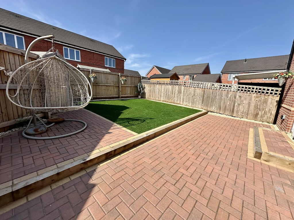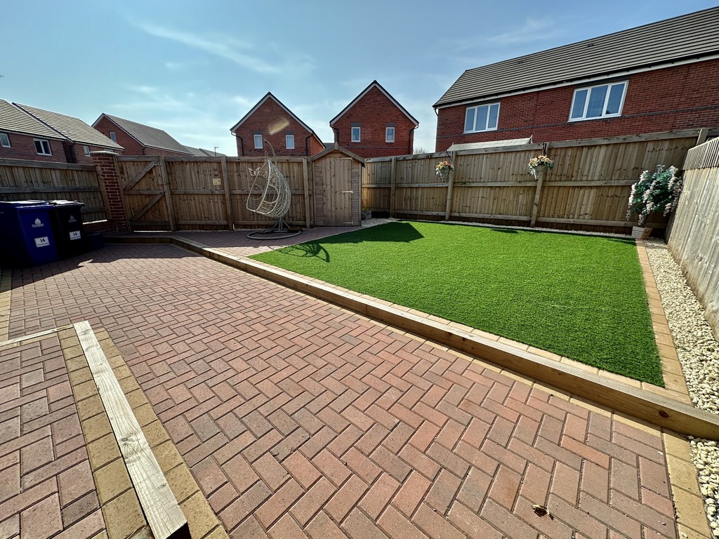 SIDE GARDEN Superb landscaped garden with central astro turf space, paved patio, paved path, shed and fence enclosure.