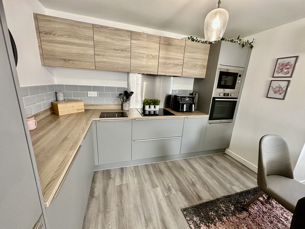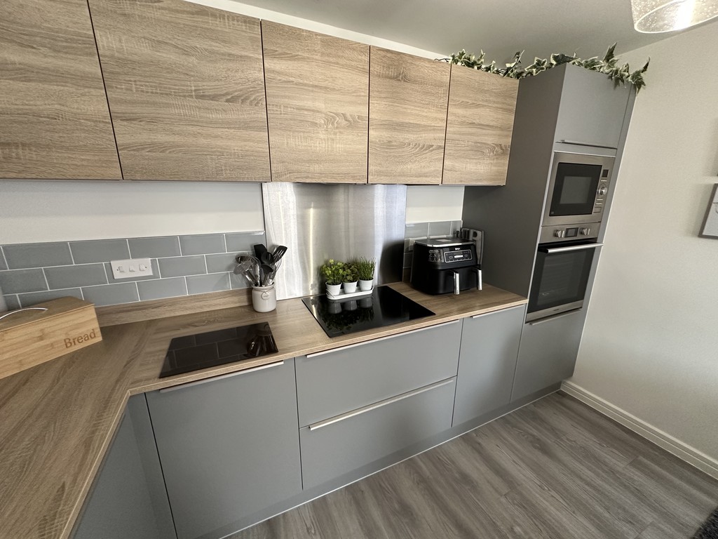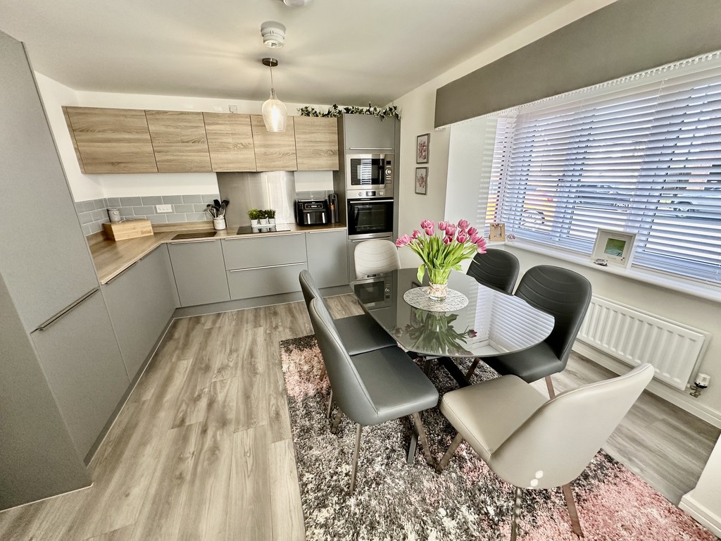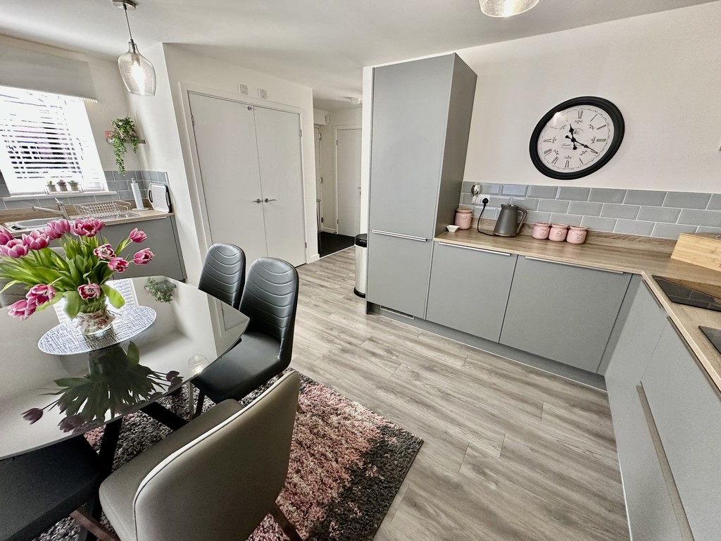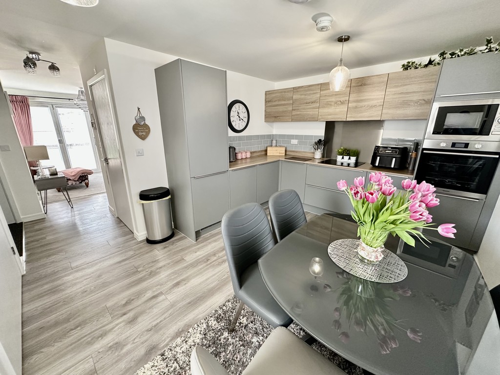 KITCHEN/DINER 10' 7" x 16' 4" (3.23m x 4.98m) Stunning kitchen/dining space with a range of modern fitted cabinetry, work surfaces incorporating a single bowl sink with drainer, four ring electric hob with extractor fan above, integrated microwave, single electric oven, integrated fridge/freezer, partially tiled splash backs, radiator, utility cupboard with plumbing for a washer and space for a dryer, side facing double glazed bay window, front facing double glazed window and open access to the entrance hallway.