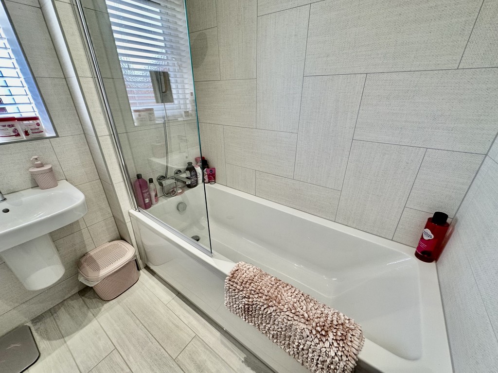BATHROOM 6' 1" x 7' 6" (1.86m x 2.31m) Beautiful bathroom with three piece suite comprising of a low flush WC, wash hand basin, bath with glass shower screen, shower mounted above, partially tiled walls, radiator, spotlights, extractor fan and side facing double glazed frosted window.