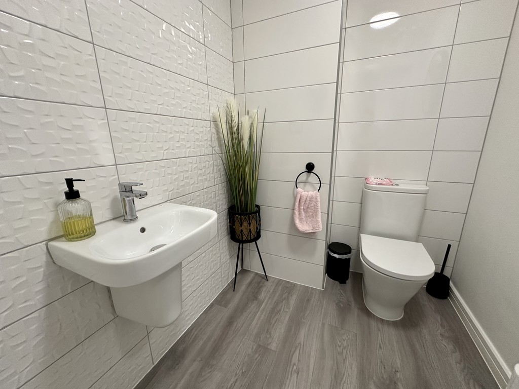WC 5' 0" x 6' 0" (1.53m x 1.83m) Benefitting from a low flush WC, floating wash hand basin, partially tiled walls, radiator and an extractor fan.