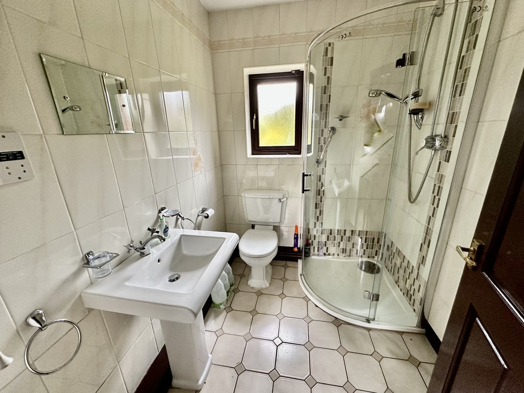 GROUND FLOOR SHOWER ROOM 7' 1" x 5' 9" (2.16m x 1.76m) Pleasantly presented shower room with corner shower cubicle, low flush WC, wash hand basin, radiator, shaving point, tiled flooring, tiled walls and a side facing double glazed frosted window.