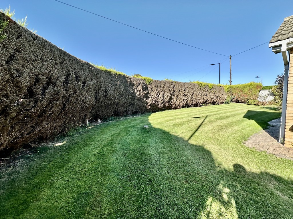 GARDEN Occupying a corner plot with majority laid to lawn, surrounding hedge provides privacy, shrub/flower beds, raised paved patio to the rear, partial fence enclosure, rear access gate to the driveway/garage, shed included and further paved patio.