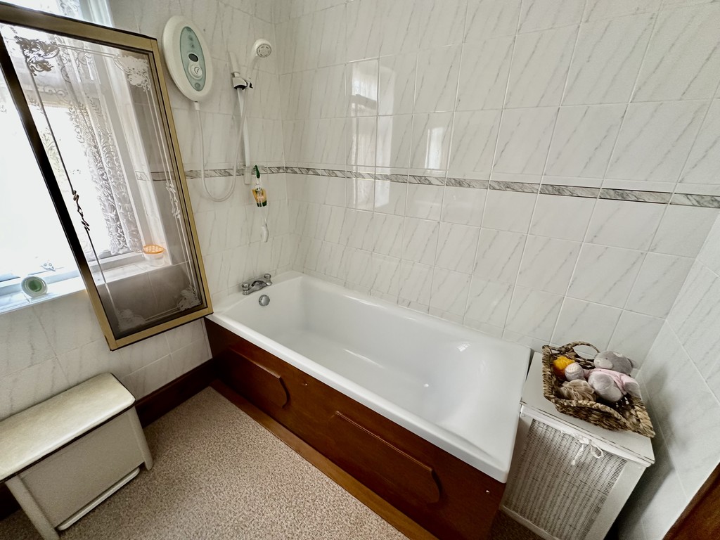 BATHROOM 7' 4" x 6' 10" (2.26m x 2.10m) Benefitting from a bath with shower screen, electric shower unit, wash basin within a vanity unit, radiator, tiled walls, extractor fan, coving and rear facing double glazed frosted window.