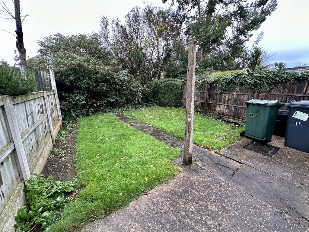 REAR GARDEN Partially fence enclosed rear garden with central lawn, mature bushes/trees and a concrete pathway.