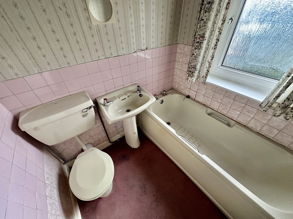 BATHROOM 5' 8" x 6' 0" (1.73m x 1.83m) The bathroom currently benefits from a three piece bathroom suite comprising of a bath, wash hand basin, WC, partially tiled walls and rear facing double glazed frosted window.