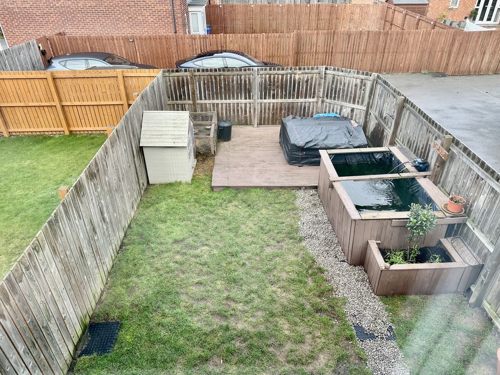 REAR GARDEN Fence enclosed rear garden with raised pond, water feature, gravelled area, raised decking, central lawn and side access gate.