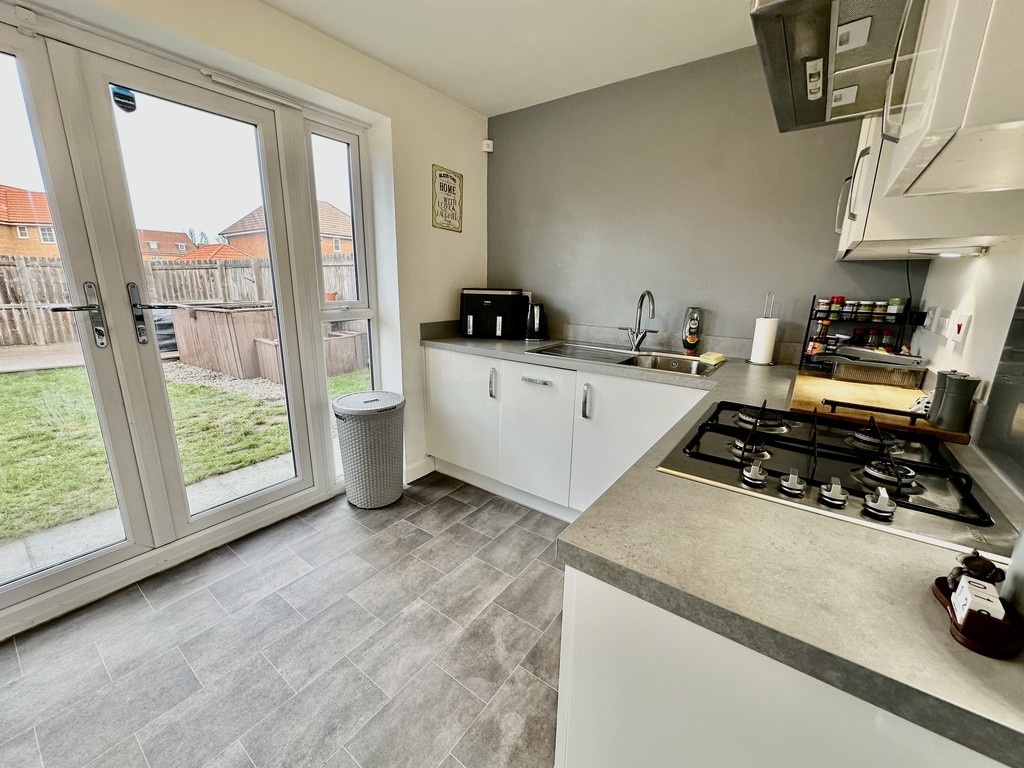 KITCHEN 12' 9" x 7' 5" (3.89m x 2.28m) Beautiful kitchen space with a range of modern fitted cabinetry at both eye and base level, work surfaces with matching splash backs incorporating a single bowl sink with drainer unit, four ring gas hob with extractor hood above, single electric oven, integrated fridge/freezer, integrated washer dryer, integrated slimline dishwasher, two rear facing double glazed windows, rear facing double glazed French doors to the garden, storage cupboard beneath the stairs and door to the WC.