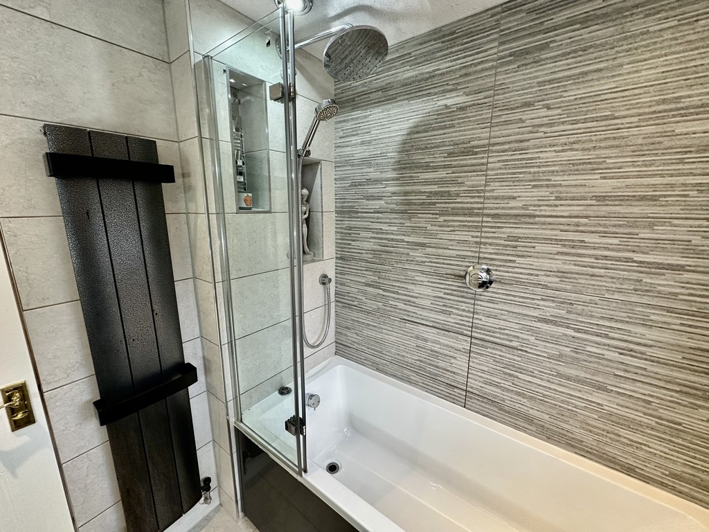 BATHROOM 6' 10" x 6' 0" (2.10m x 1.83m) Fabulous modern bathroom with bath, shower screen mounted above, dual shower head, concealed shower control, extractor fan, spotlights, heated towel radiator, wash hand basin within a vanity unit, low flush WC, rear facing double glazed frosted window, tiled flooring and tiled walls.