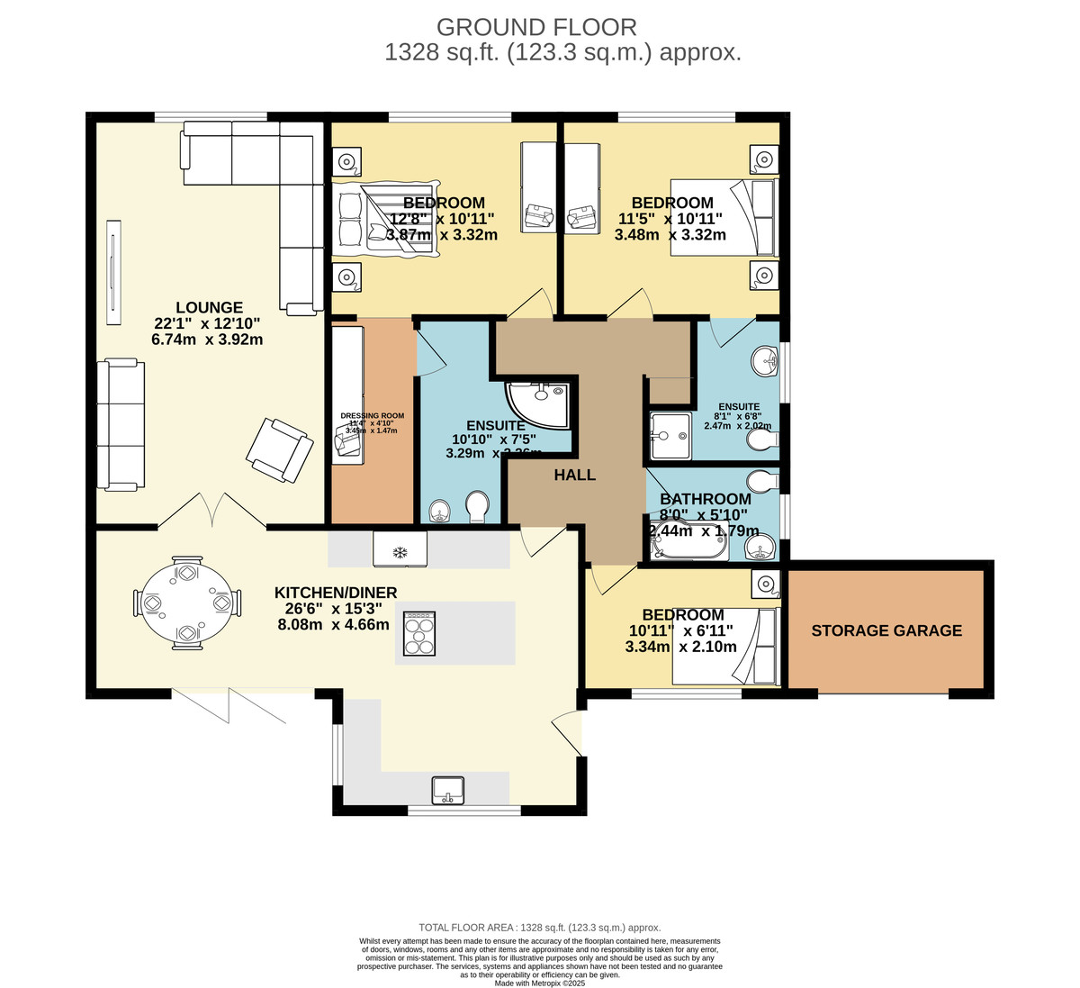 ENSUITE 7' 4" x 10' 9" (2.26m x 3.29m) Immaculately presented shower room with corner shower cubicle, dual shower head, low flush WC, wash hand basin, partially tiled walls, tiled flooring, spotlights and an extractor fan.