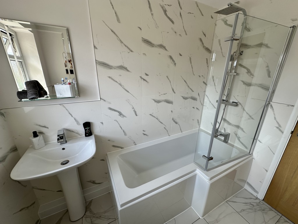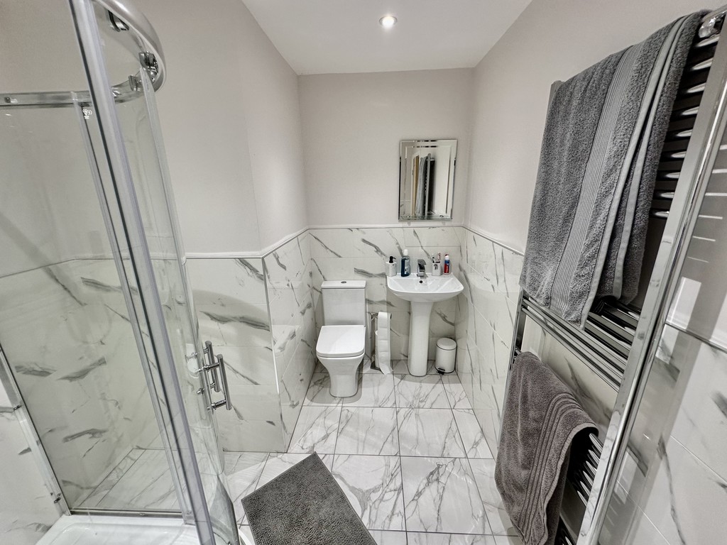 ENSUITE 4' 8" x 6' 7" (1.44m x 2.02m) Beautiful en-suite shower room with further shower cubicle, dual shower head, half tiled walls, tiled flooring, heated towel radiator, low flush WC, wash hand basin, spotlights, extractor fan and side facing double glazed frosted window.