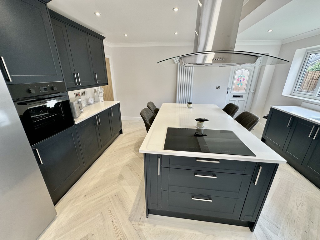 LIVING KITCHEN/DINER 26' 6" x 15' 3" (8.08m max x 4.66m max) Superb open plan kitchen space with living/dining area, rear bi-folding double glazed doors to the patio, side/rear facing double glazed windows, side facing double glazed frosted door, stunning new kitchen with breakfast central island incorporating two wine coolers, five ring induction hob with central extractor fan above, a range of fitted navy blue cabinetry, beautiful work surfaces incorporating a single bowl sink with drainer, single electric oven, space for an American style fridge/freezer with plumbing for water/ice, integrated dishwasher, integrated washer/dryer, two vertical radiators, coving to the ceiling, Karndean flooring, double doors to the lounge and further door to the inner hallway.