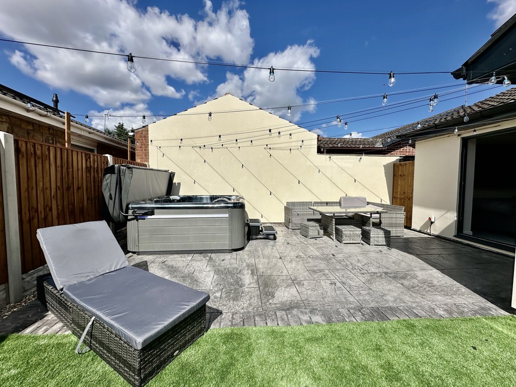 REAR GARDEN Private rear garden with paved patio, central astro turf, fence enclosure, space for hot tub, gravelled/pebbled beds and side gate to the driveway.