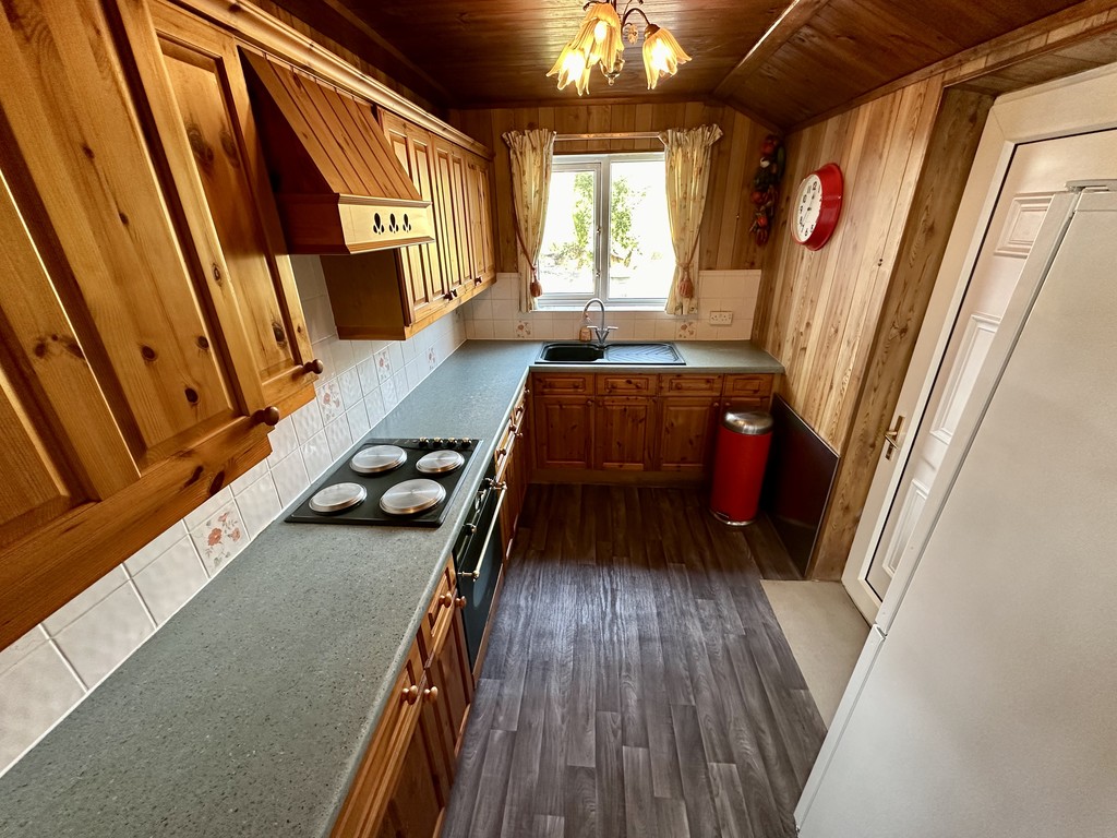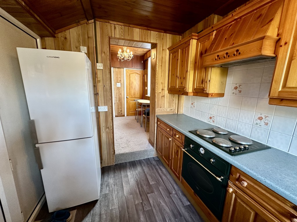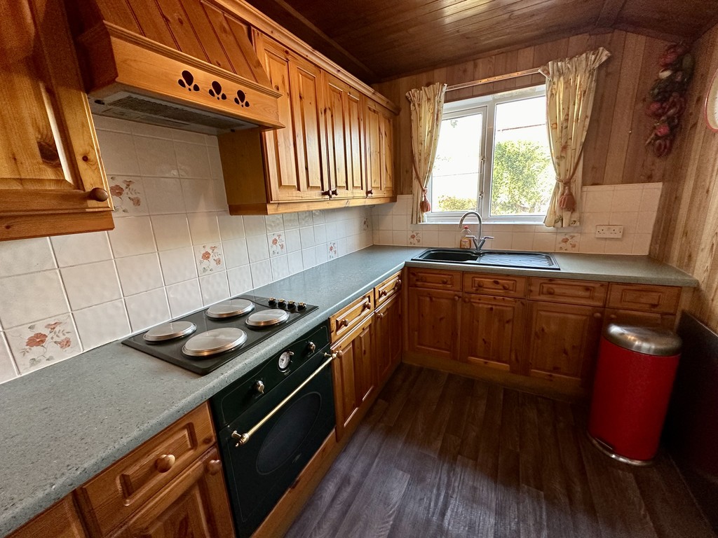 KITCHEN 10' 6" x 7' 0" (3.22m x 2.15m) The kitchen has a range of fitted cabinetry offering plenty of storage at both eye and base level, work surfaces incorporating a single bowl sink with drainer unit, four ring electric hob with extractor fan above, single electric oven, space for a fridge/freezer, plumbing for a washing machine, partially tiled walls, wood panelled ceiling/walls, rear facing double glazed window and side facing door to the rear garden.