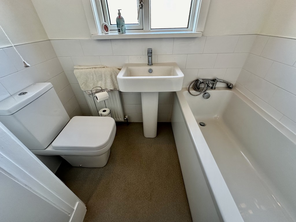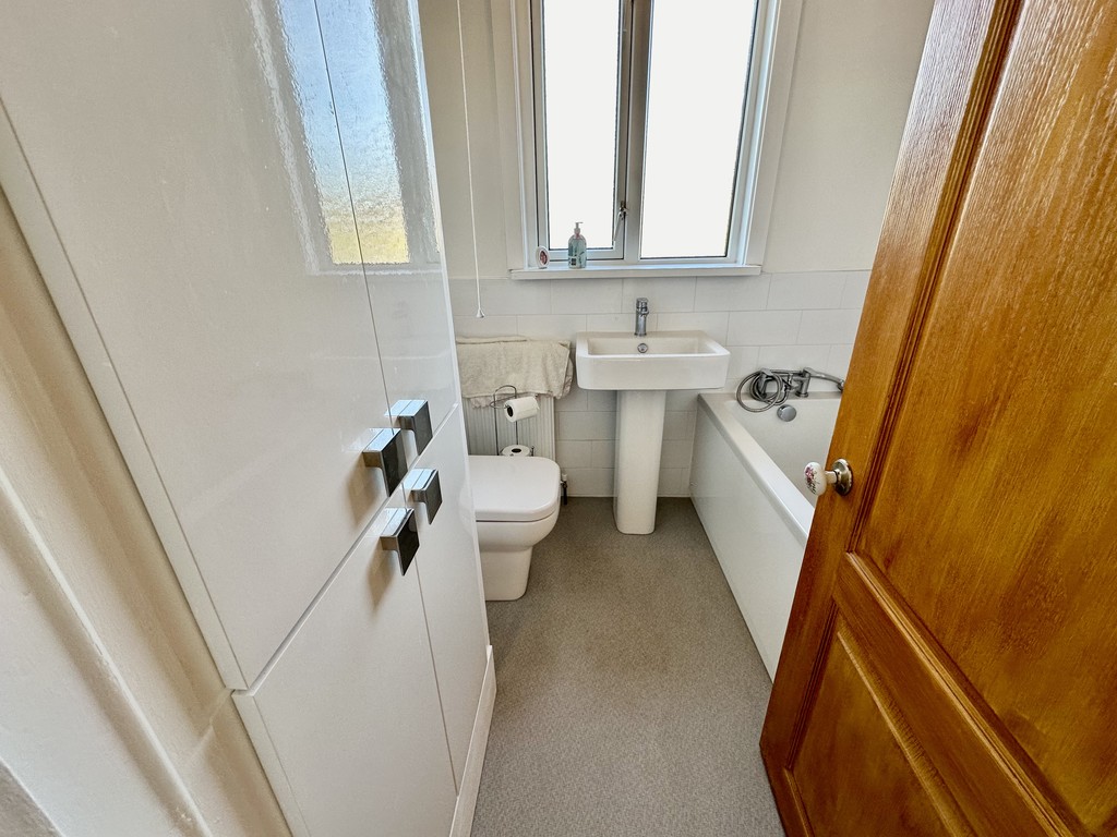BATHROOM 6' 2" x 6' 5" (1.88m x 1.96m) Nicely presented bathroom with a three piece suite comprising of a low flush WC, wash hand basin, bath, partially tiled walls, storage cupboard, radiator, wood panelled ceiling and rear facing double glazed frosted window.