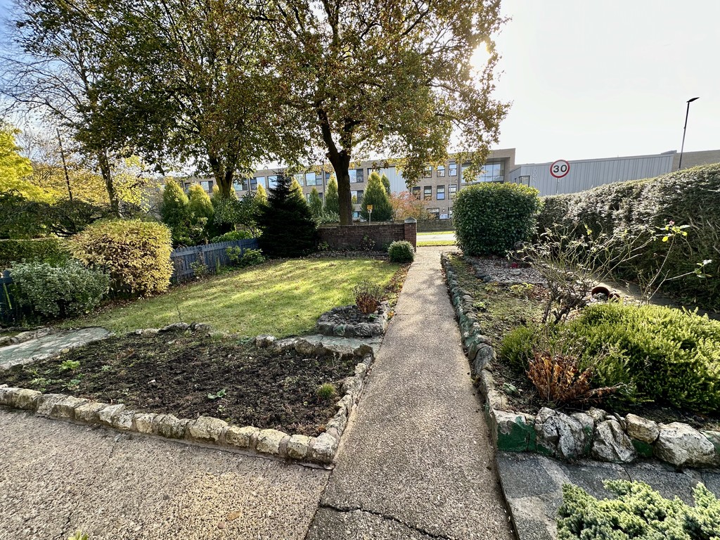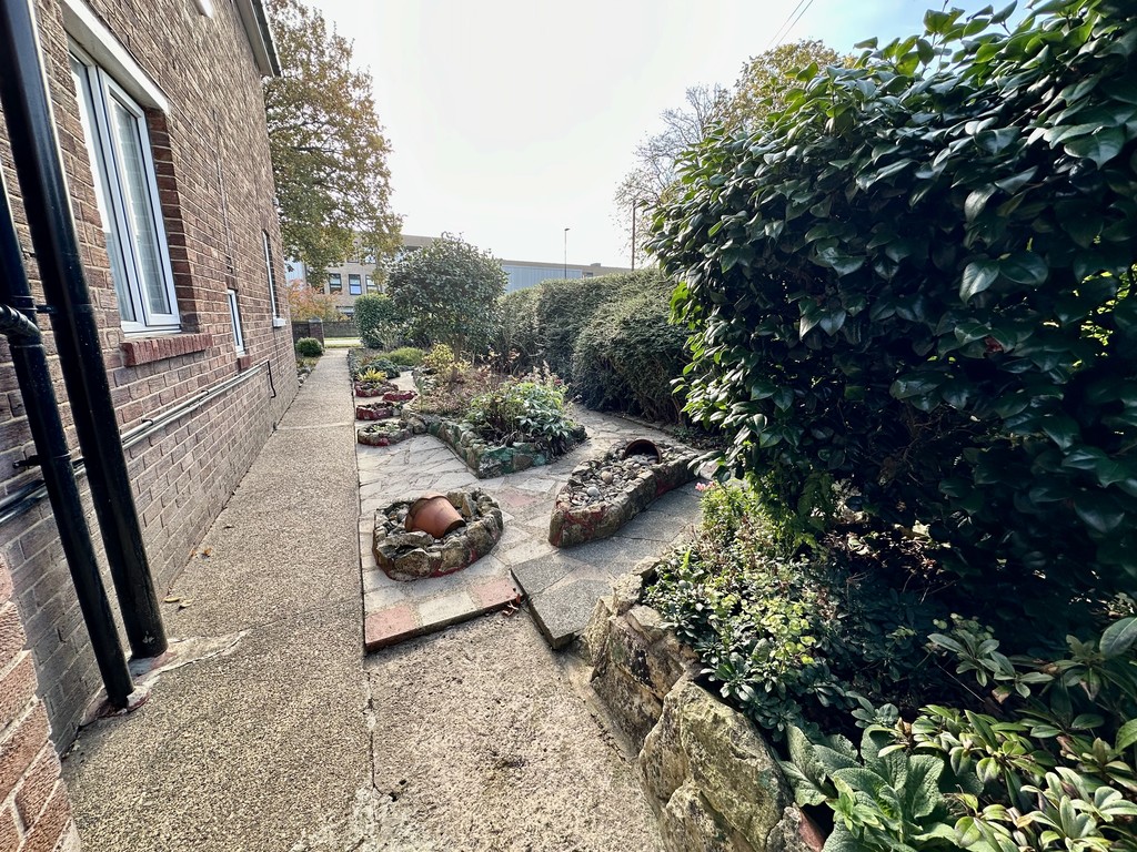FRONT/SIDE GARDEN Lawned front garden with shrub/flower beds, concrete path, side access gate to the rear garden, raised rockery and hedge to the side.