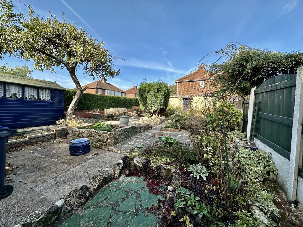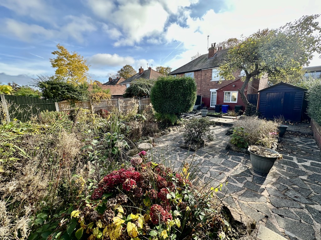 REAR GARDEN Enclosed rear garden with paved tiered areas, mature busshes/trees, raised planting beds, fence/hedge enclosure, side door to the garage at the rear and a shed.