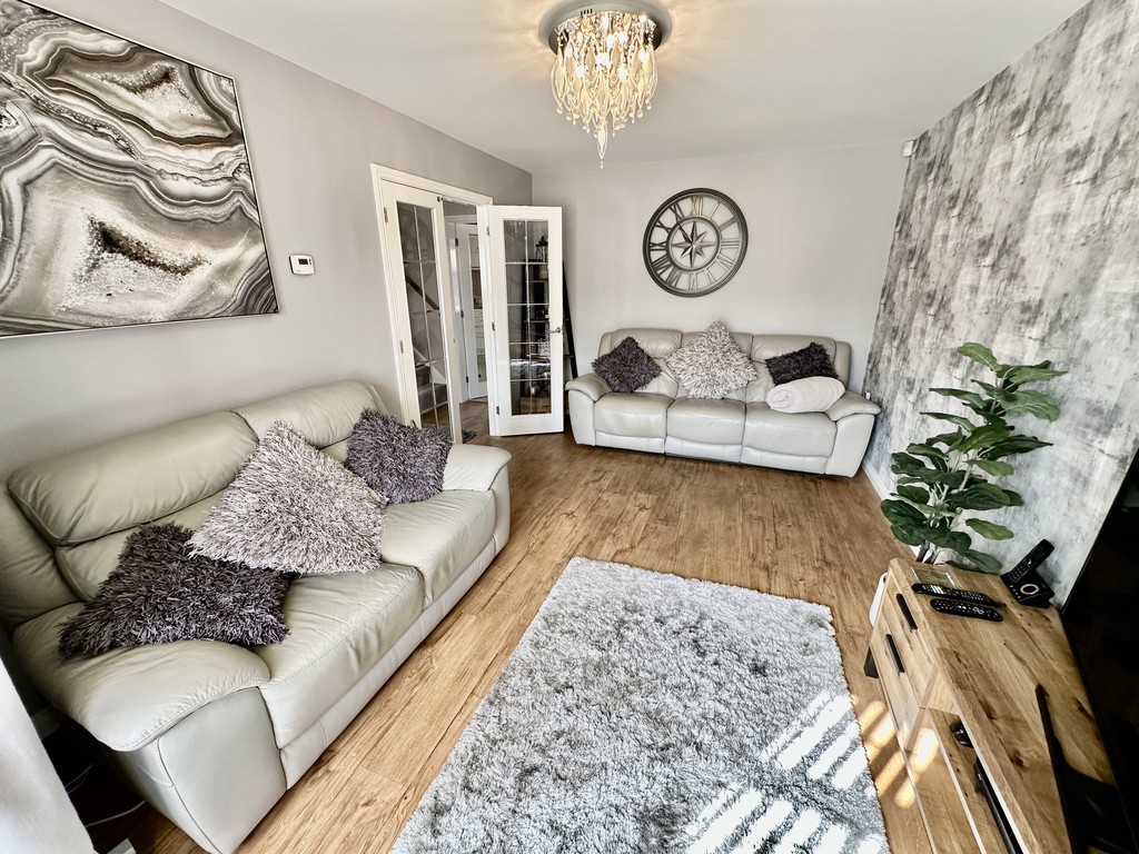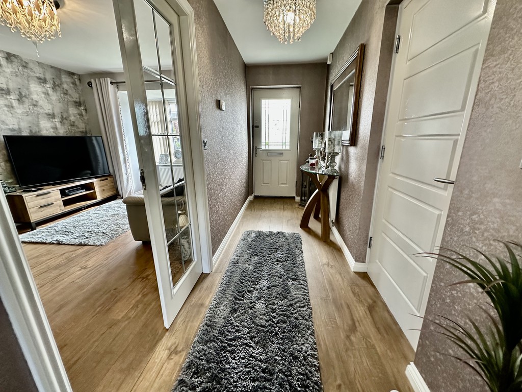 ENTRANCE HALL 4' 3" x 14' 7" (1.32m x 4.45m) This superb family home is accessed via the front facing double glazed frosted door to the hallway, radiator, stairs to the first floor, door to the garage, door to the kitchen and double doors to the living room.