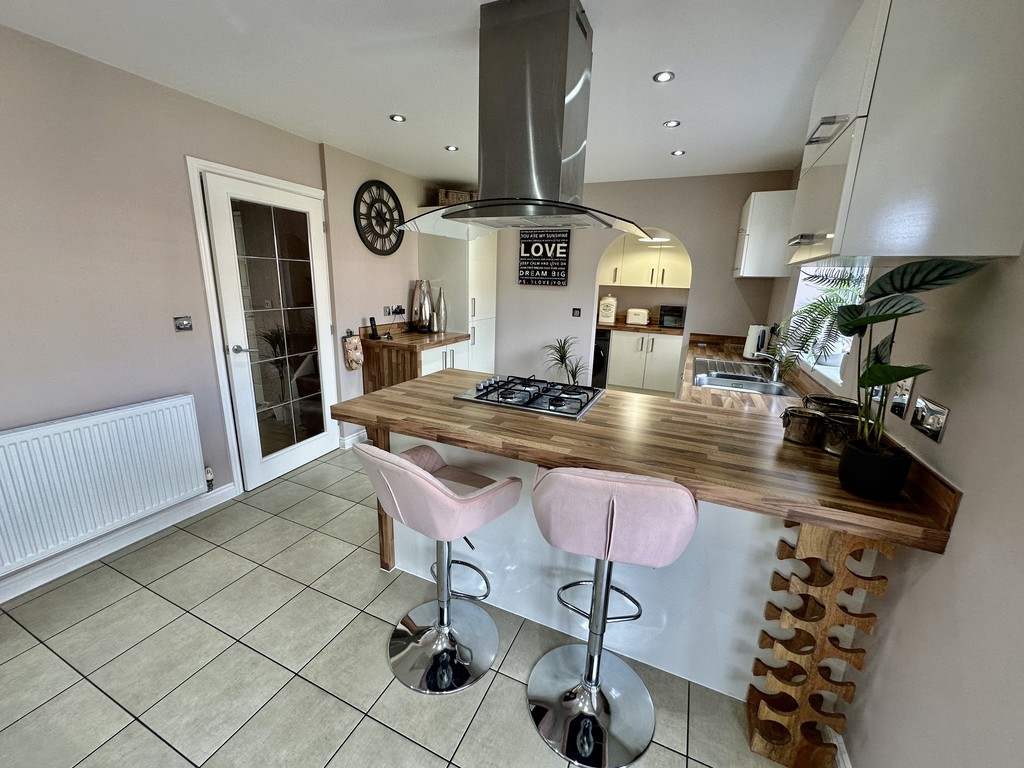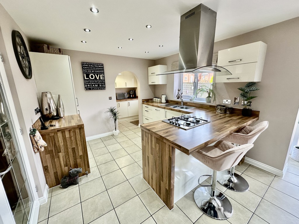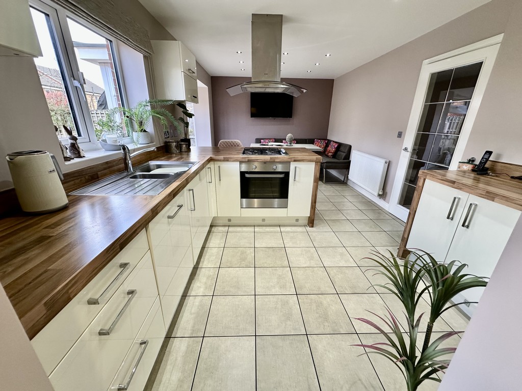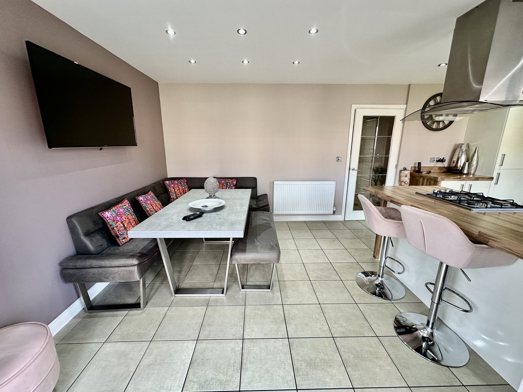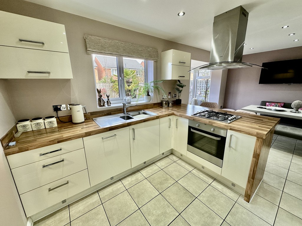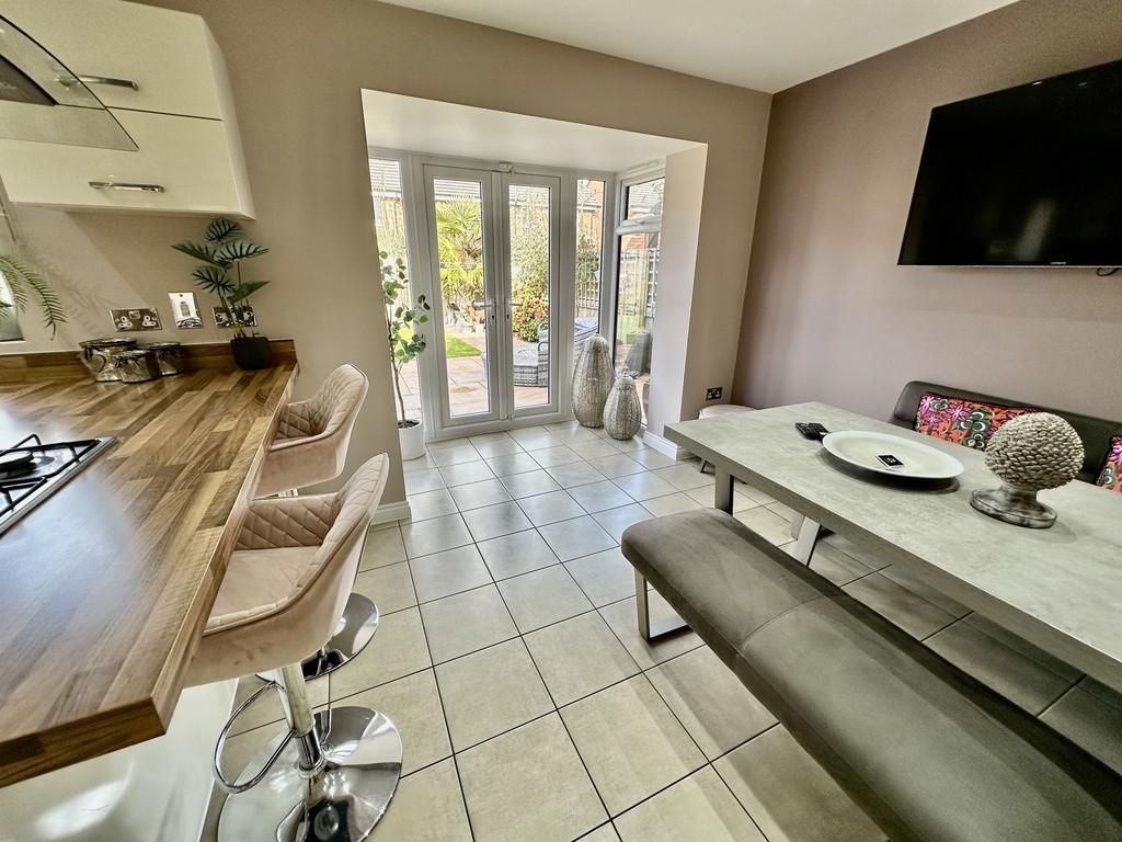 KITCHEN/DINER 19' 1" x 10' 7" (5.83m x 3.24m) Lovely open plan kitchen/dining space with rear facing double glazed French doors to the patio, rear/side facing double glazed windows, open access to the utility room, range of fitted cabinetry at both eye and base level, work surfaces with matching splash backs incorporating a single and half bowl sink with drainer, four ring gas hob with extractor hood above within the matching breakfast bar, electric single oven, integrated dishwasher, integrated fridge/freezer, tiled flooring, spotlights and a radiator.